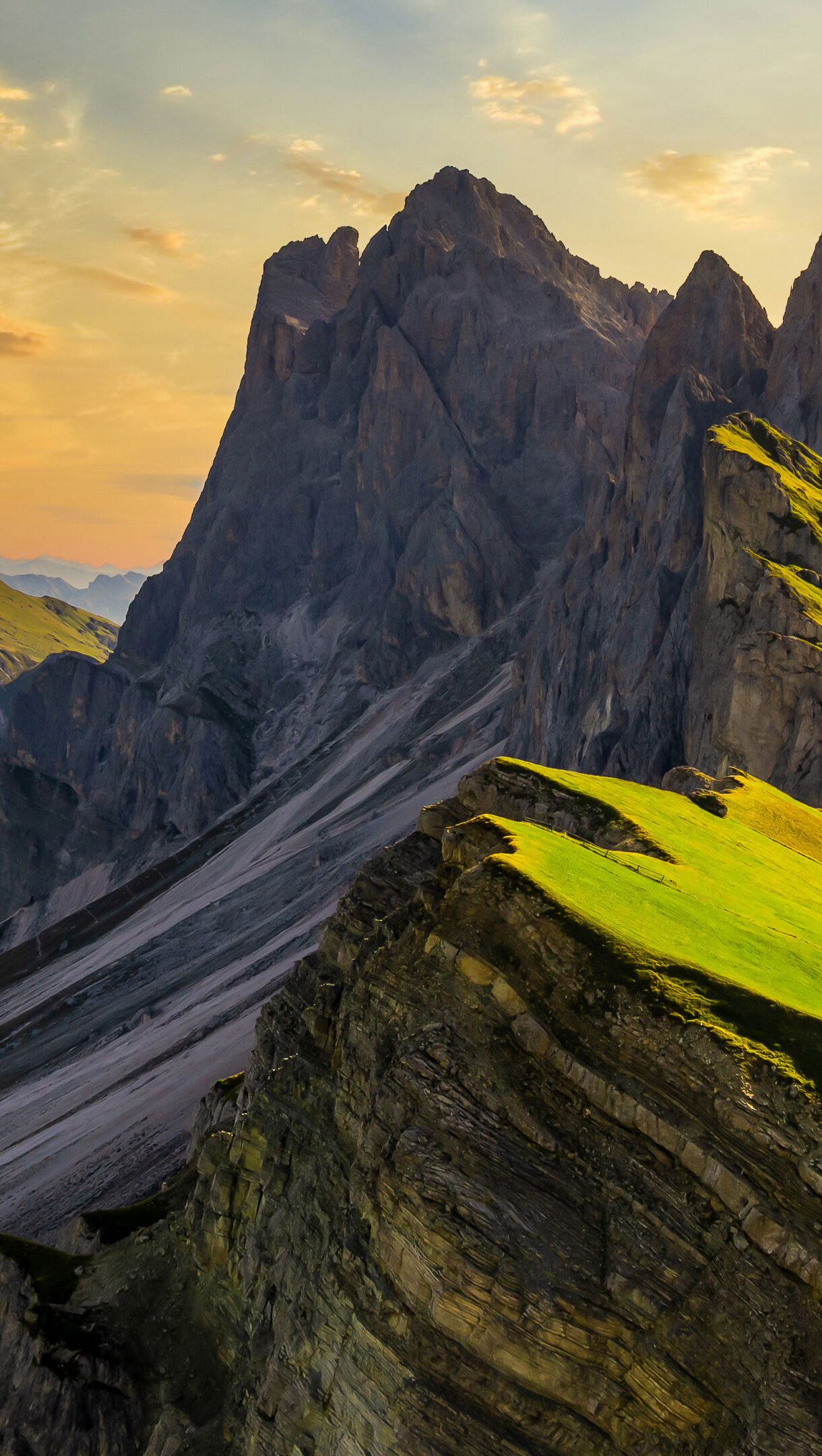 An epic 4K wallpaper showcases the iconic Seceda Peak in the Dolomites, magnificently illuminated during a vibrant sunset. The golden light brilliantly highlights the jagged grey ridges and the intensely green, sun-drenched slopes, creating a powerful contrast and a sense of awe.