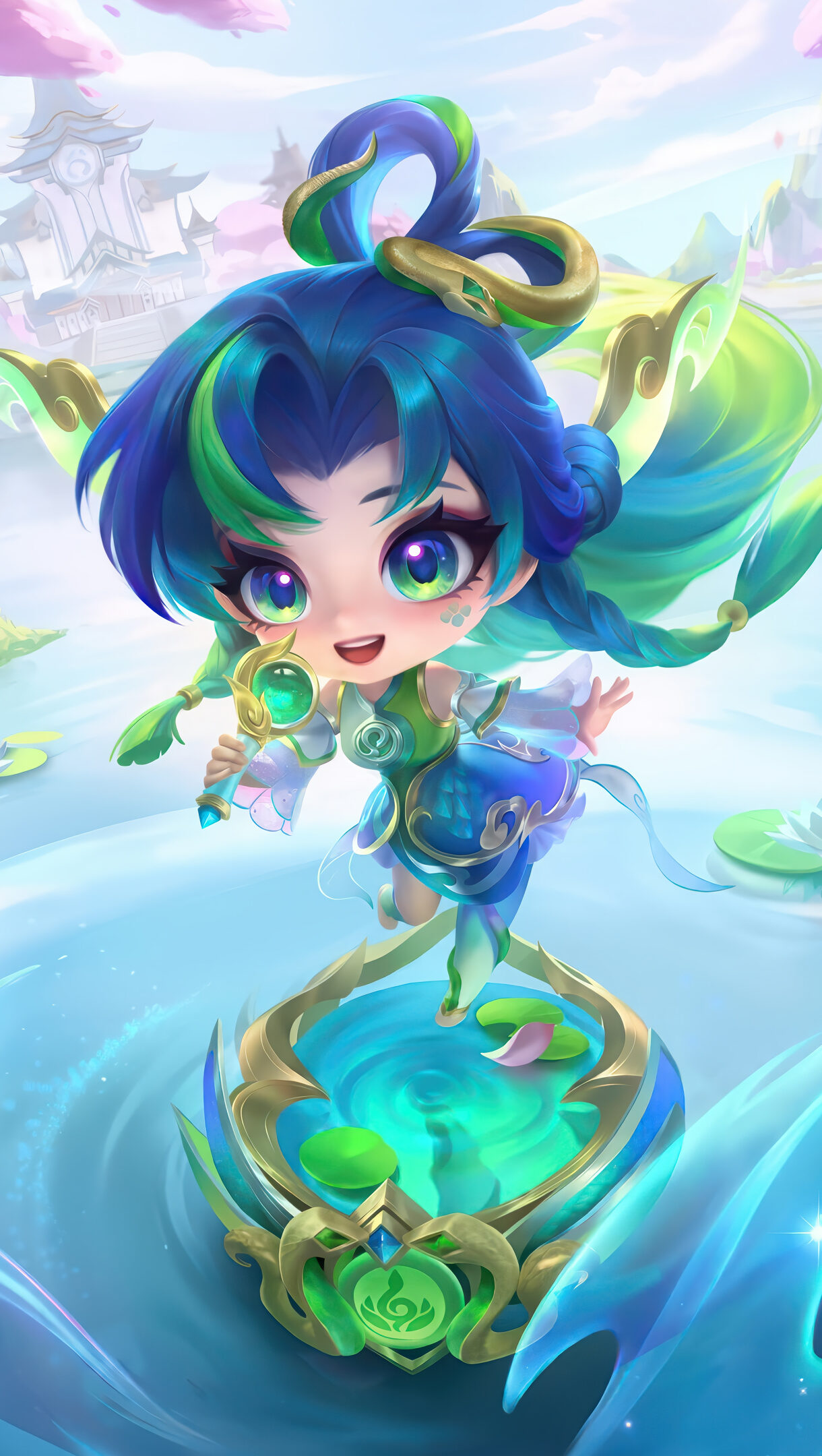 A vibrant 4K wallpaper showcasing a charming chibi character with luminous eyes and flowing blue and green hair, gracefully poised above a serene water garden with lily pads and a distant, misty Asian-inspired landscape. Swirling ethereal ribbons of light in shades of blue and green emanate from her, creating a magical, dreamlike atmosphere filled with sparkling luminescence.