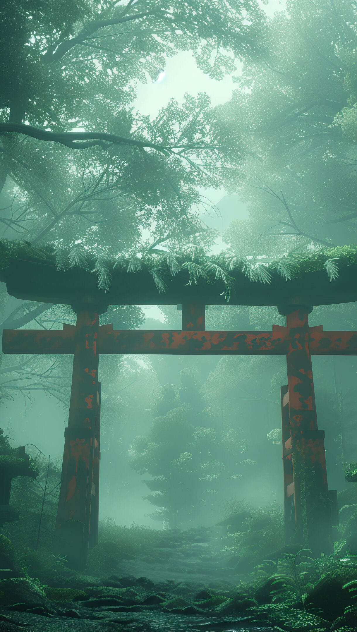A serene 4K wallpaper featuring a traditional Japanese torii arch set against a backdrop of lush green nature. The tranquil scene captures the essence of peace and spirituality, making it a perfect choice for your desktop or mobile background.