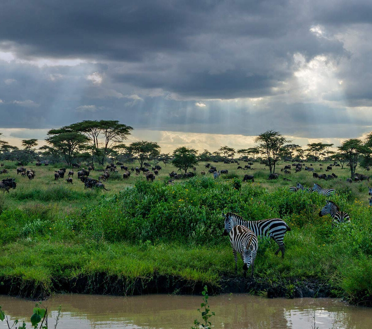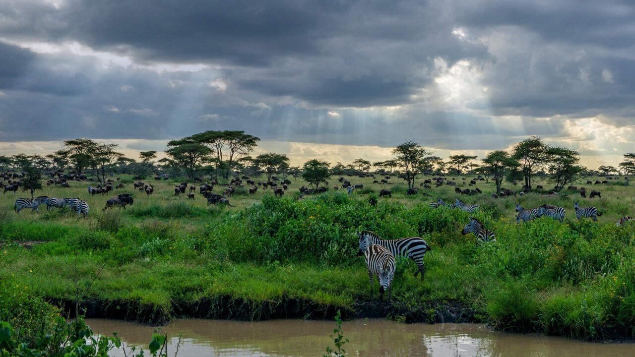 An expansive 4K wallpaper captures the breathtaking wildlife of Serengeti National Park, with vast herds of zebras and wildebeests grazing across the lush green savanna dotted with acacia trees. Dramatic rays of sunlight pierce through a stormy, overcast sky, casting a majestic glow over the teeming landscape and the muddy stream in the foreground.