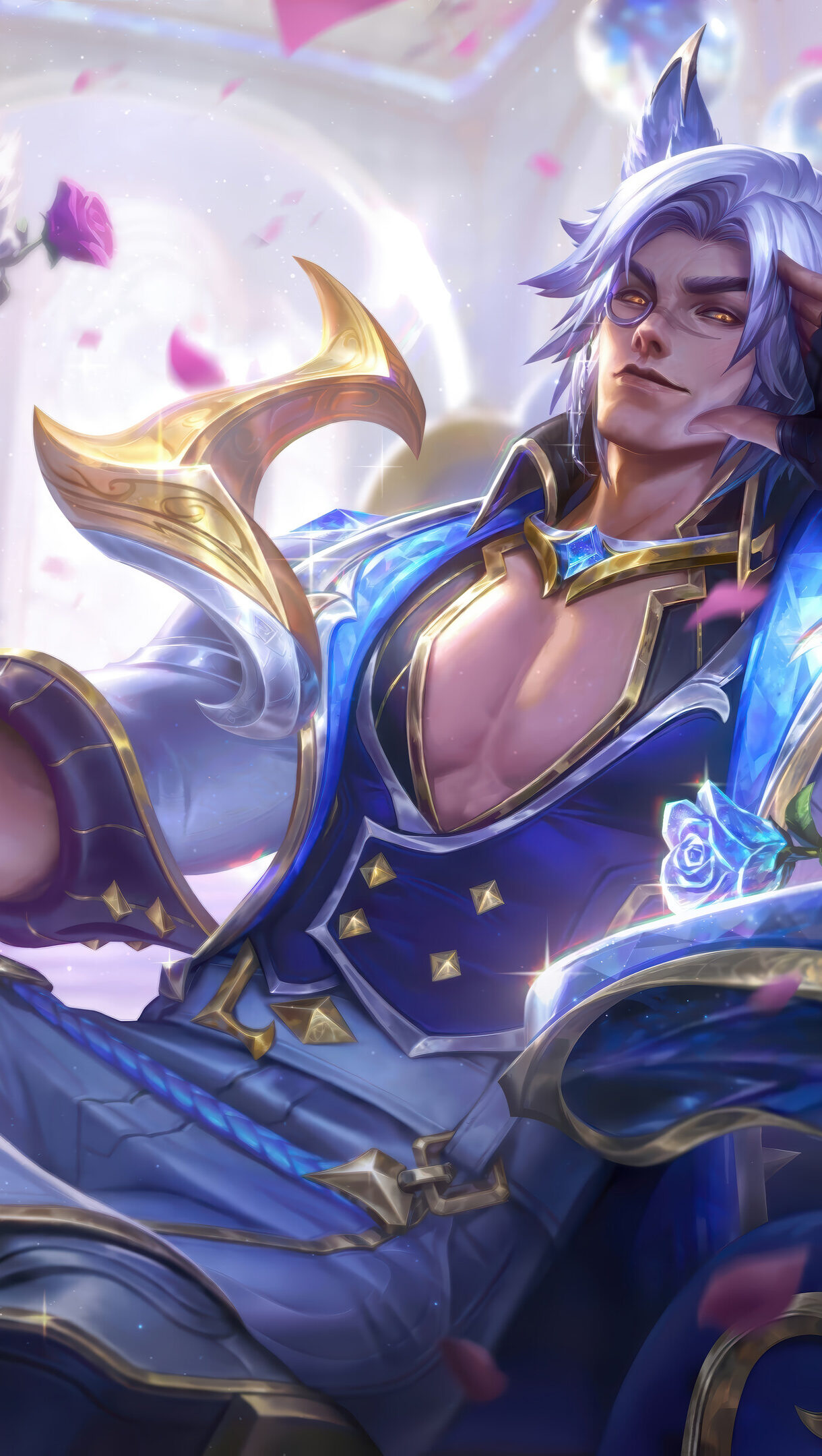 A dazzling 4K wallpaper showcases Sett in his Crystal Rose skin, lounging confidently in an opulent, romantic setting adorned with blue roses and shimmering light. His intricate blue and gold attire, detailed with sparkling crystals, perfectly complements the ethereal purple and pink lighting and falling rose petals, evoking a lavish and magical atmosphere.