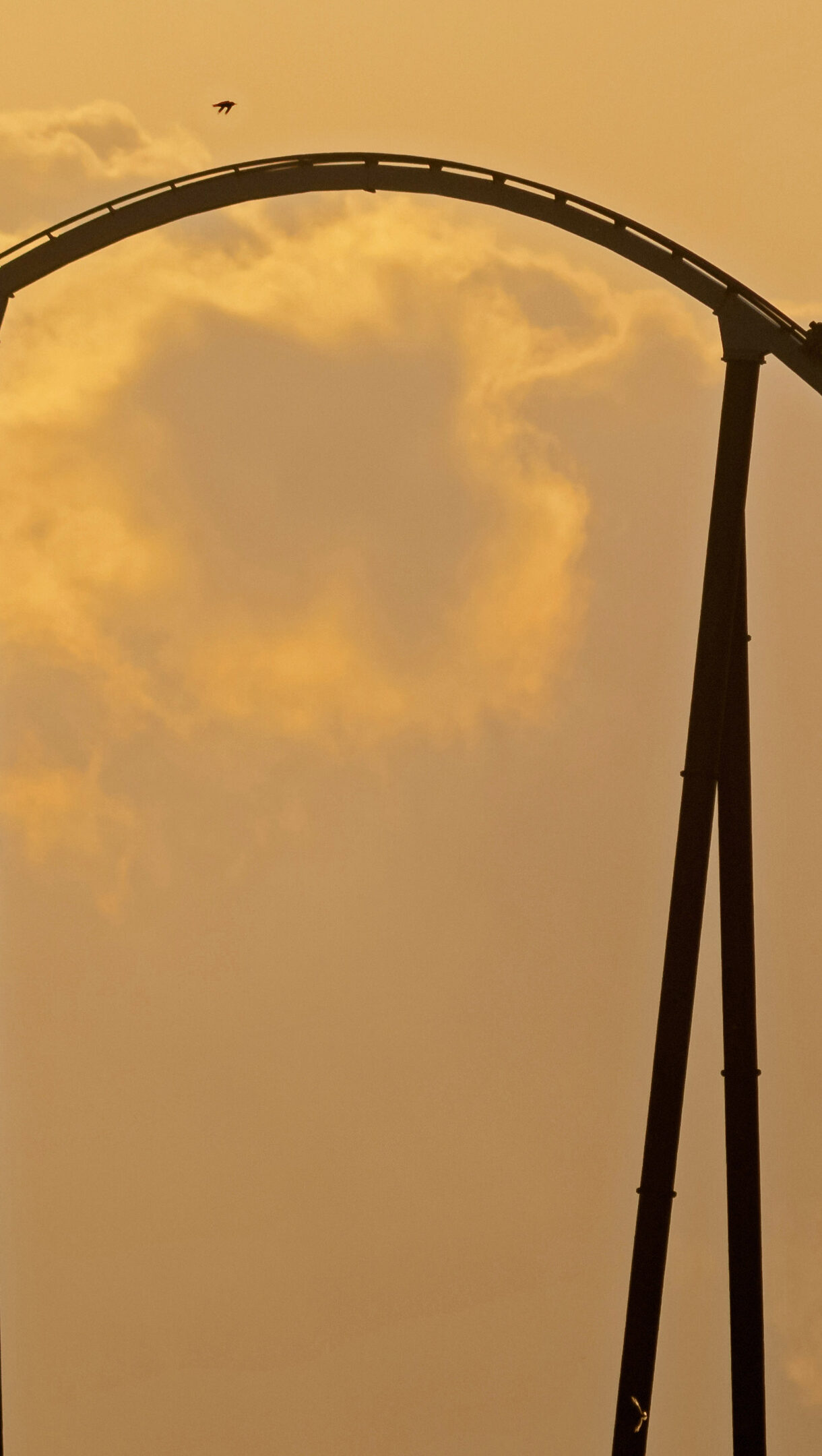 A breathtaking 4K wallpaper captures the majestic silhouette of the Shambhala Roller Coaster at PortAventura Park, ascending its highest peak during sunset. The track's dark outline and the riders' silhouetted, cheering forms create a powerful sense of height and exhilaration against the sky's dramatic golden-orange glow.