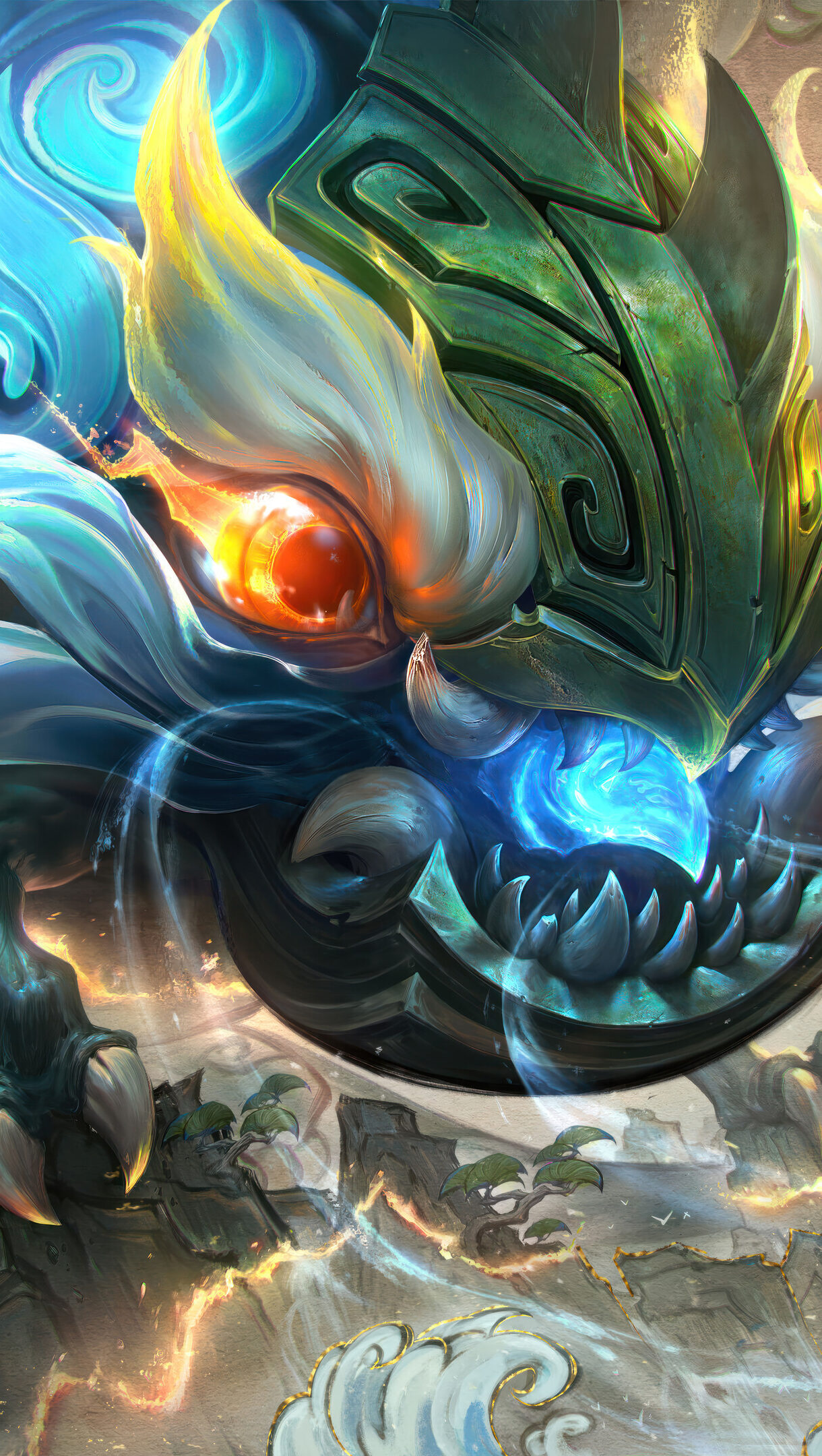 A captivating 4K wallpaper showcasing the Shan Hai Scrolls Kog'Maw skin from League of Legends. Kog'Maw, the Voidborn creature, is adorned in intricate and vibrant designs inspired by the Shan Hai Scrolls theme, depicting an ancient mythical world. Simply click the download button to bring this masterpiece to life on your screen as a desktop wallpaper or save it for later in your picture collection.