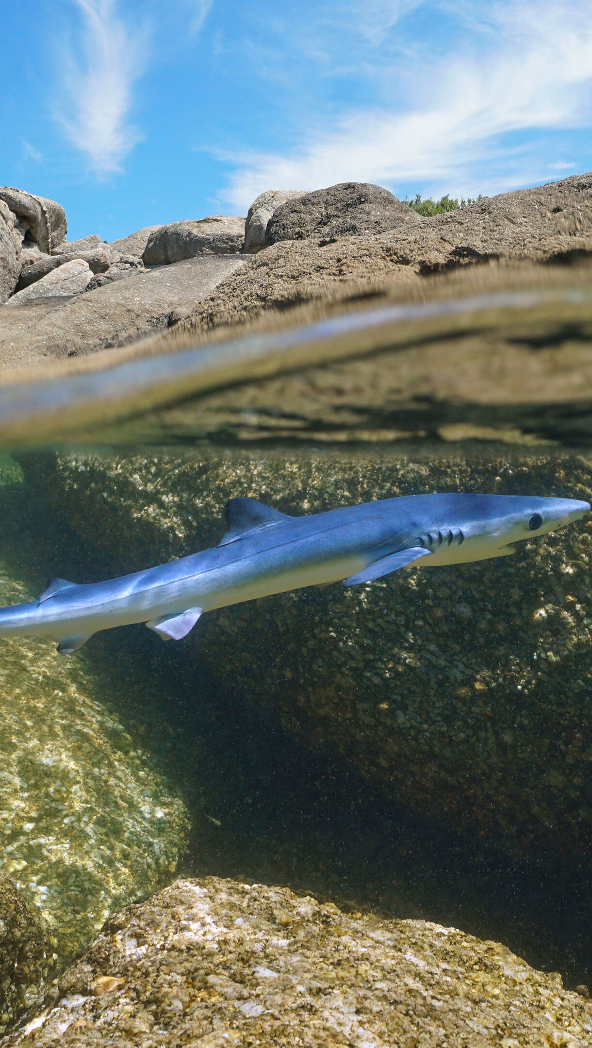 An immersive 4K wallpaper showcases a sleek shark gracefully swimming just below the surface, captured in a split view of the sun-drenched rocky coast of Galicia, Spain. The interplay of clear blue sky and rugged coastal rocks above the water perfectly complements the bright, detailed underwater world, highlighting the shark's elegant form against the textured seabed.