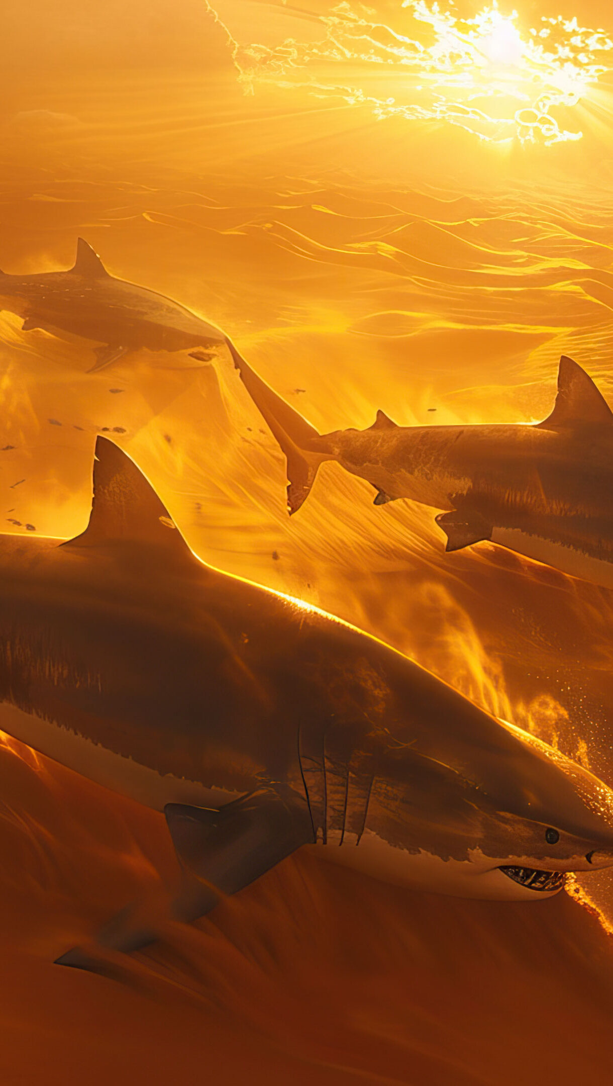 A surreal 4K wallpaper featuring sharks swimming seamlessly through a sandy desert landscape. This AI-generated artwork blends elements of the ocean and desert, creating a unique and imaginative visual experience ideal for your desktop or mobile wallpaper.
