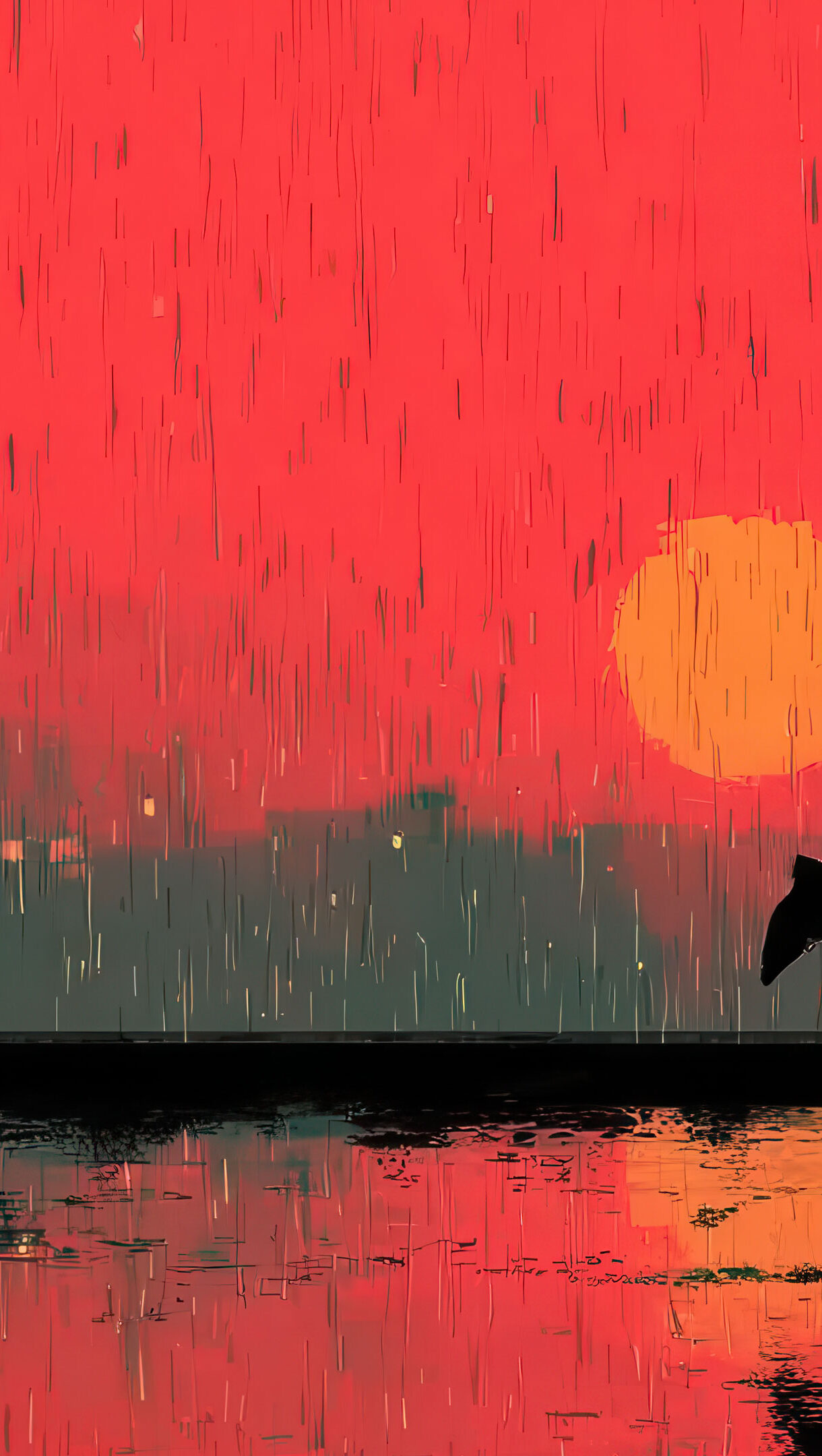 An evocative 4K wallpaper captures a silhouetted couple sharing an intimate kiss against a rainy, vibrant red city skyline. The intense red sky, illuminated by a central orange orb and streaked with vertical rain, dramatically contrasts with their dark forms, creating a powerful mood of enduring passion.