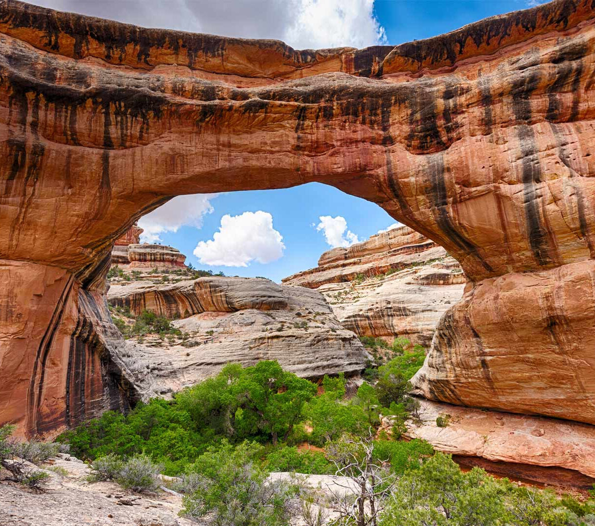 An immersive 4K wallpaper showcasing the massive Sipapu Bridge, a natural rock arch spanning a lush canyon floor within Natural Bridges National Monument, Utah. The warm orange and red sandstone of the bridge, streaked with dark mineral deposits, frames a brilliant blue sky and distant lighter rock formations, creating a majestic scene of natural grandeur.