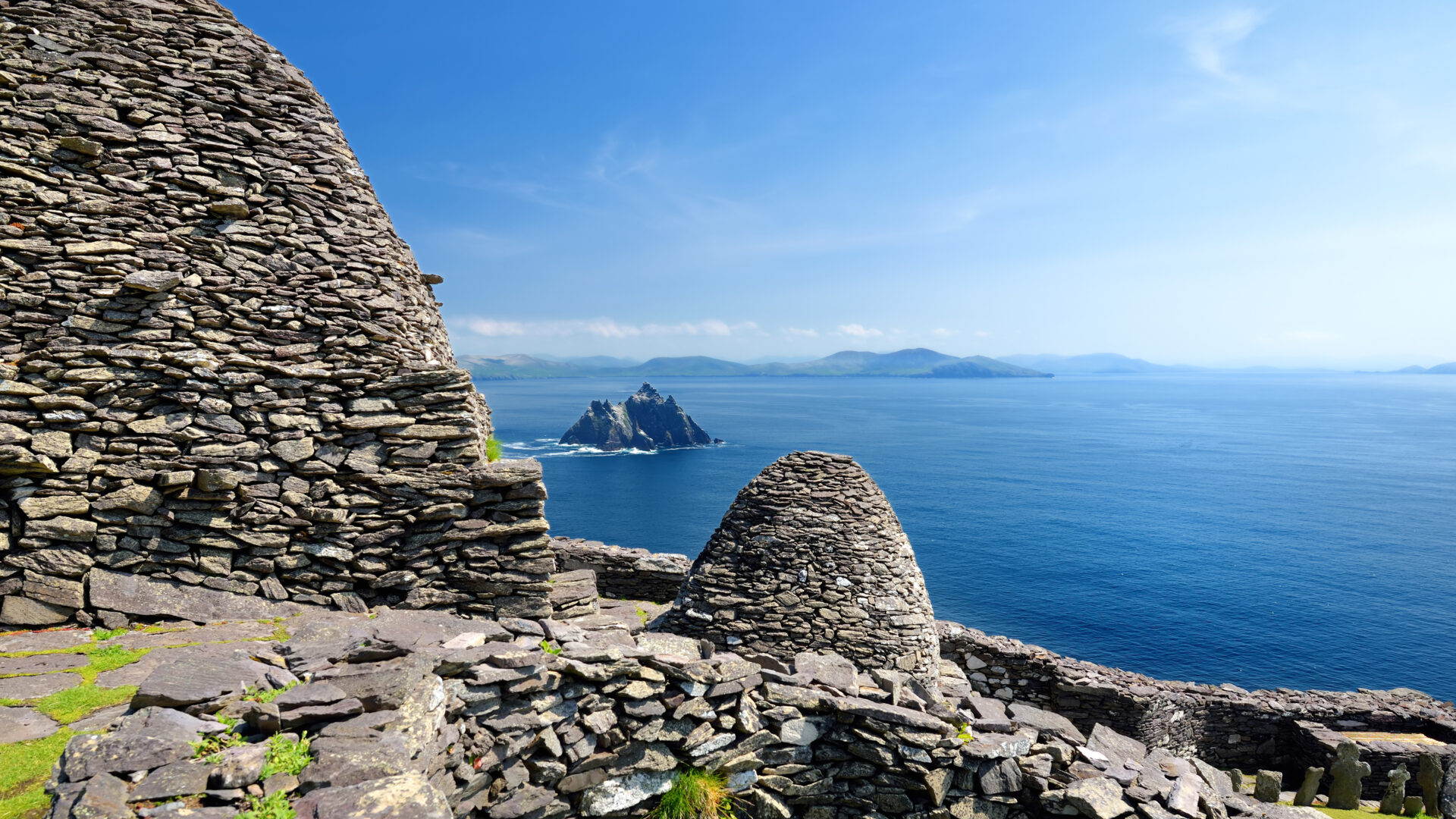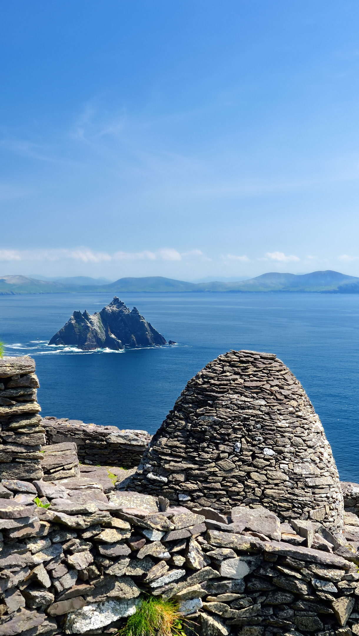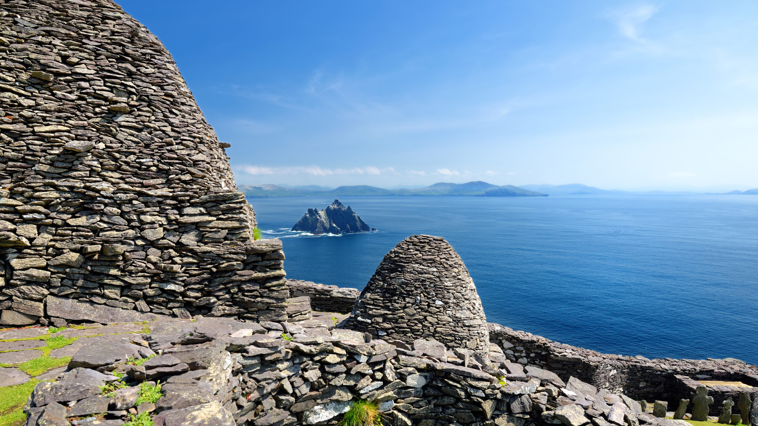 An ancient 4K wallpaper showcases the rugged Skellig Michael monastery ruins, dramatically overlooking the expansive, deep blue Atlantic Ocean. The striking dry-stone structures, illuminated by brilliant sunlight, foreground the distant, mist-shrouded islands and the seemingly endless, shimmering sea.