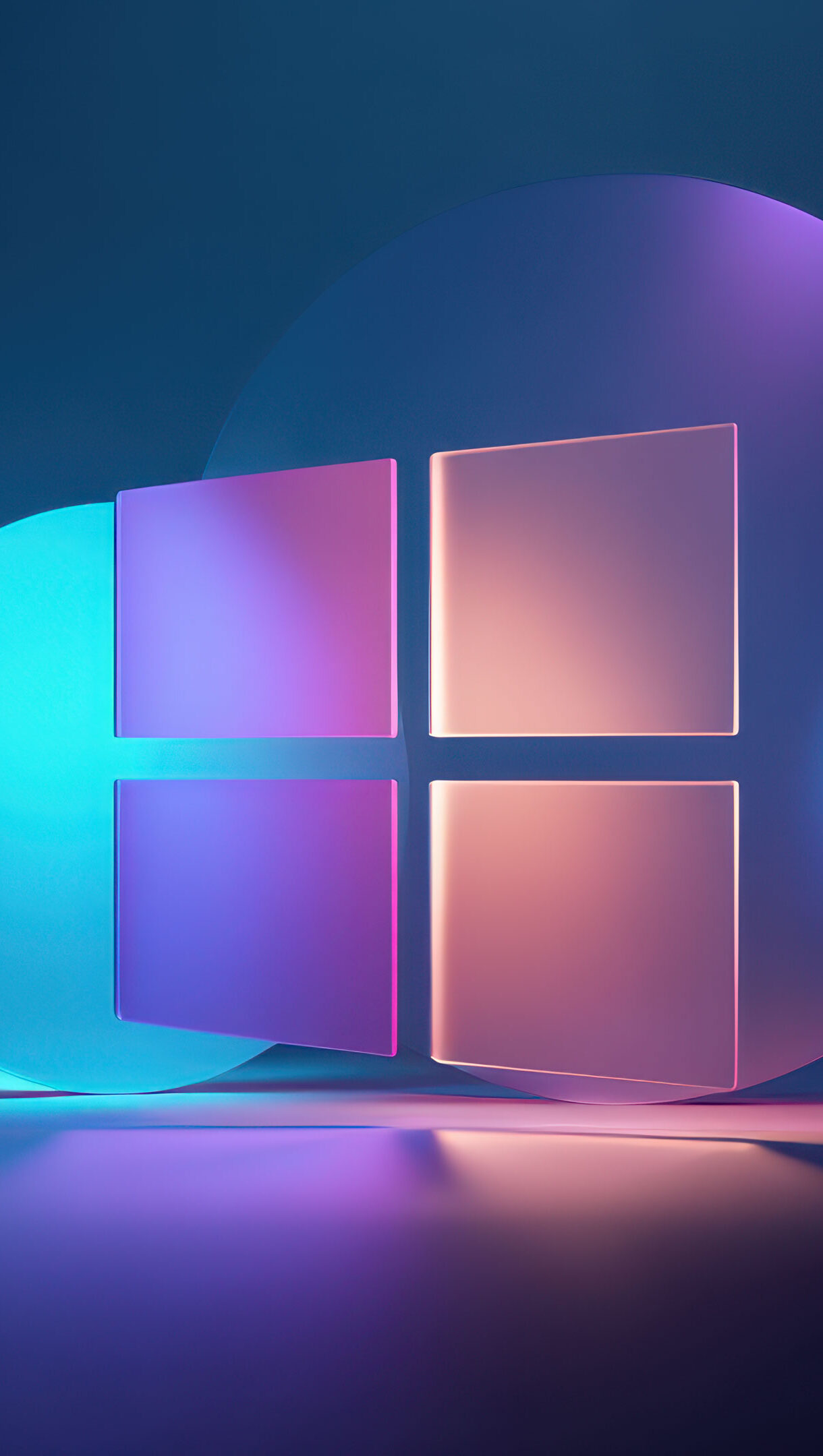 A radiant 4K wallpaper featuring a sleek, modern Windows logo composed of four translucent square panes, set against a deep blue, minimalist background with glowing circular forms. Vibrant gradients of neon blue, purple, and orange light illuminate the translucent materials, creating a luminous, futuristic art piece with soft reflections on the dark surface below.