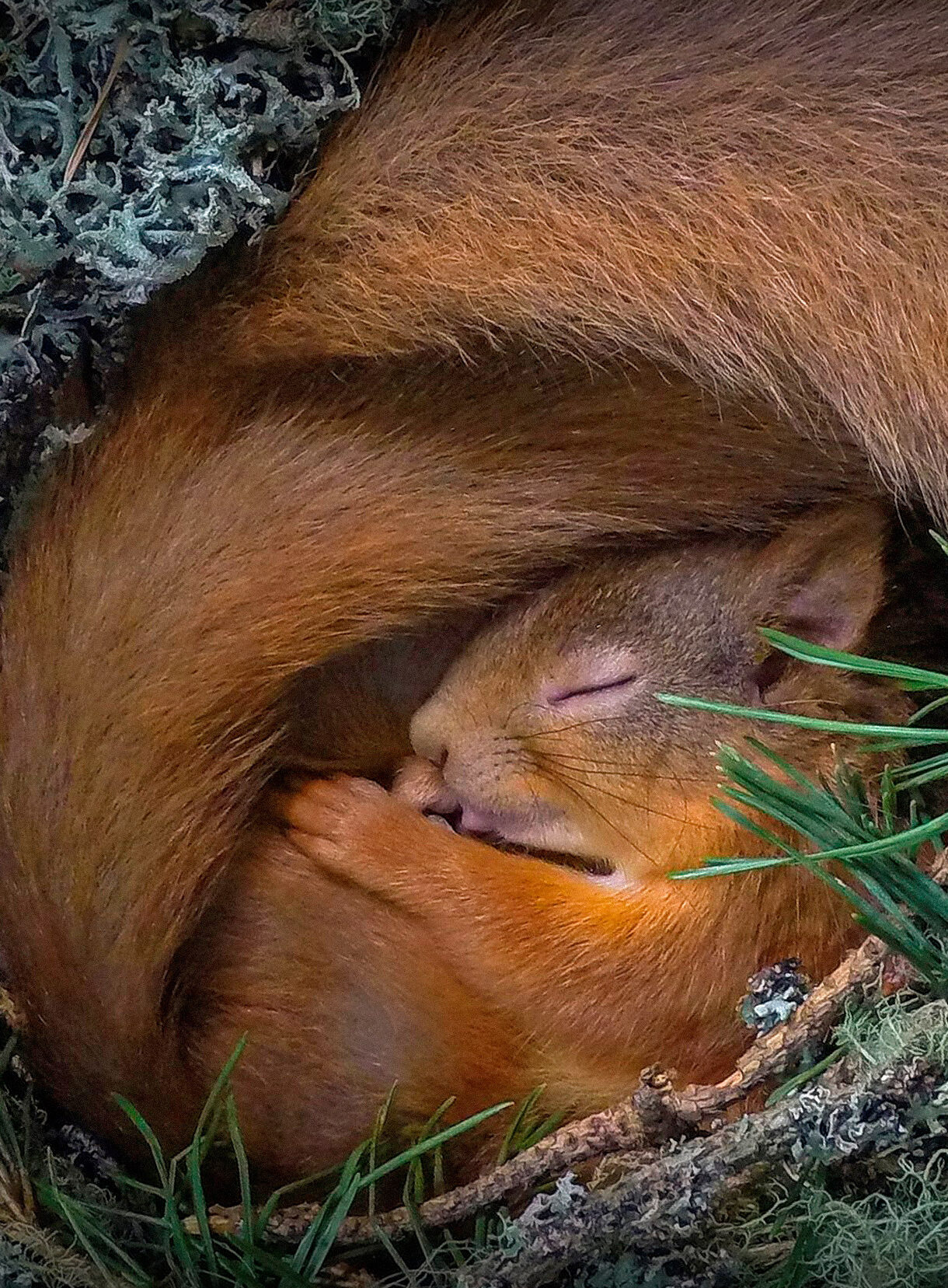 An endearing 4K wallpaper captures a red squirrel curled up and soundly sleeping in its lichen nest, nestled within the natural environment of the Scottish Highlands. Its vibrant auburn fur glows softly as it snuggles deeply into the intricate, pale green lichen and dark pine needles, creating a scene of profound peacefulness.