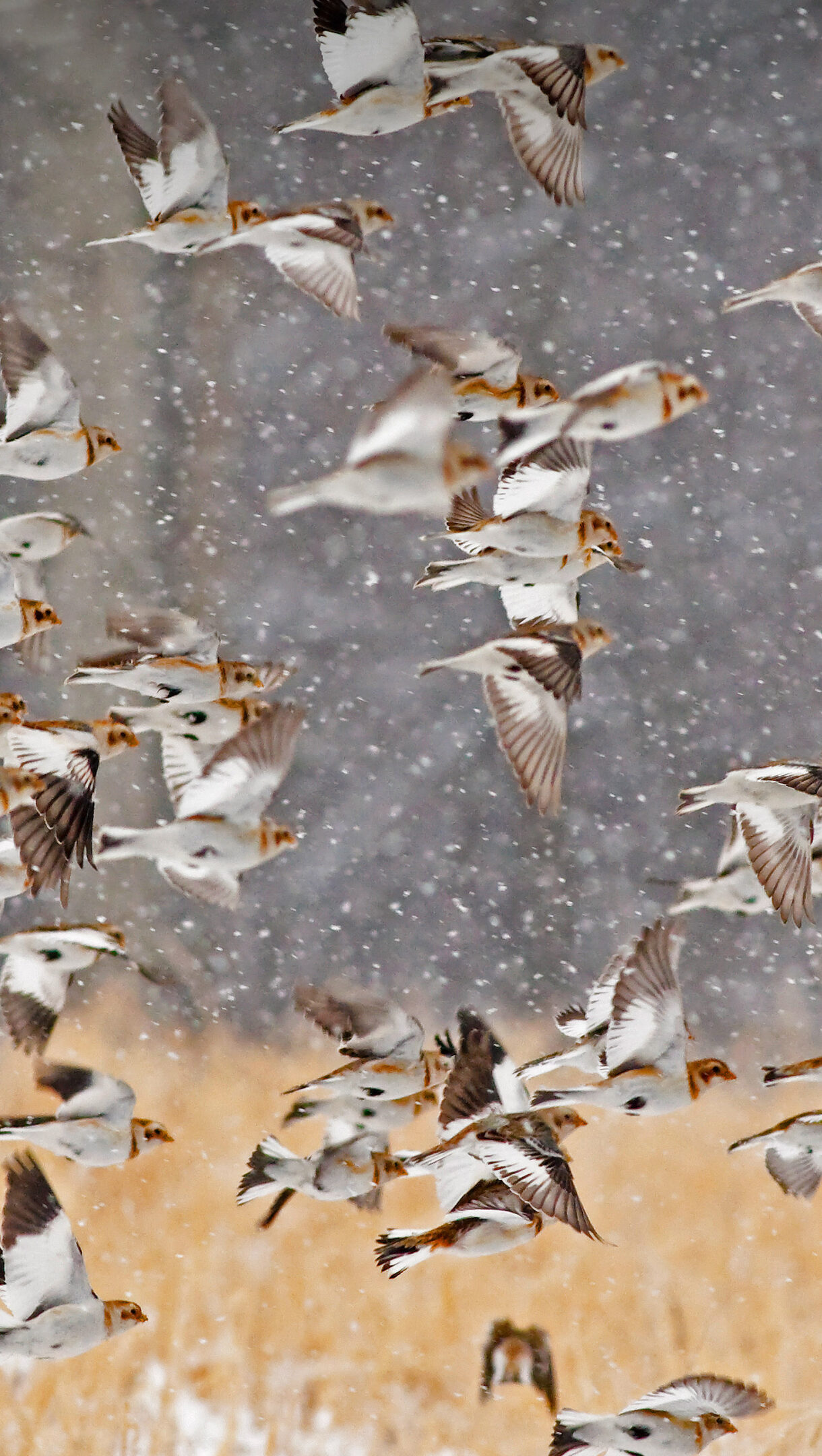 A breathtaking 4K wallpaper showcasing a large flock of Snow Buntings actively flying amidst a heavy New York snowstorm. The countless individual snowflakes create a dynamic, ethereal backdrop that accentuates the birds' crisp white and brown plumage against the muted golden winter grasses below.