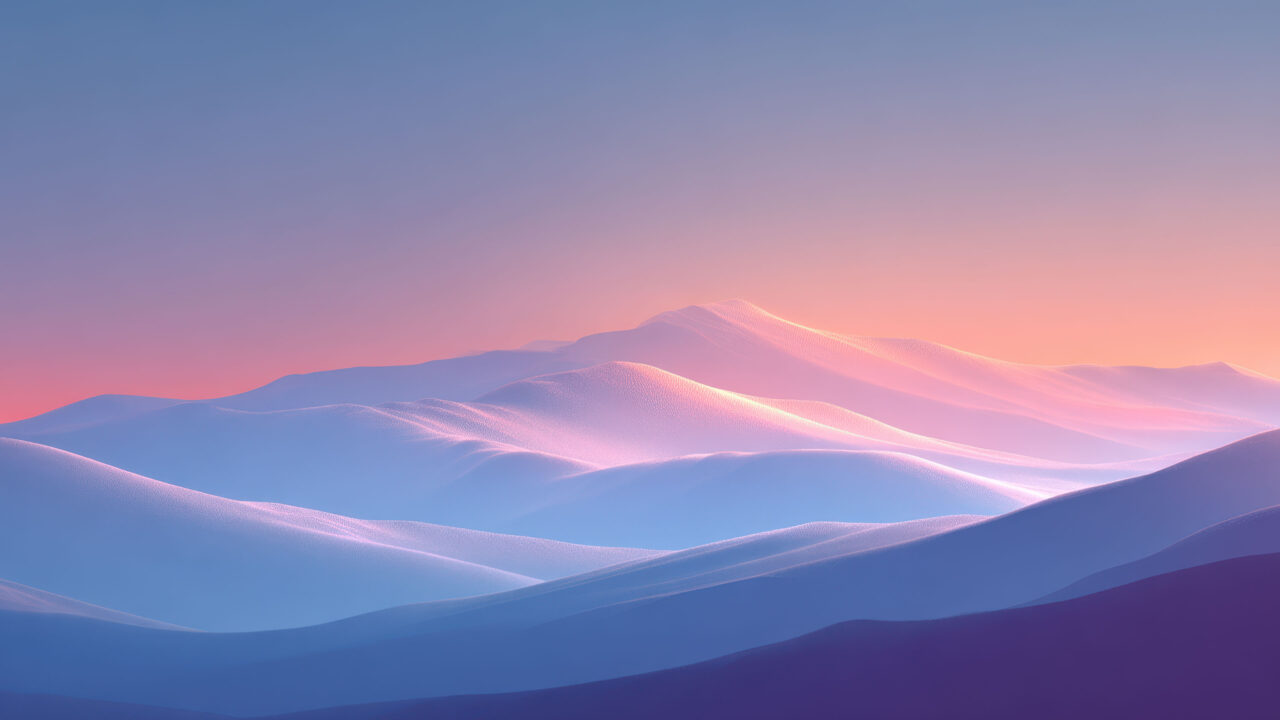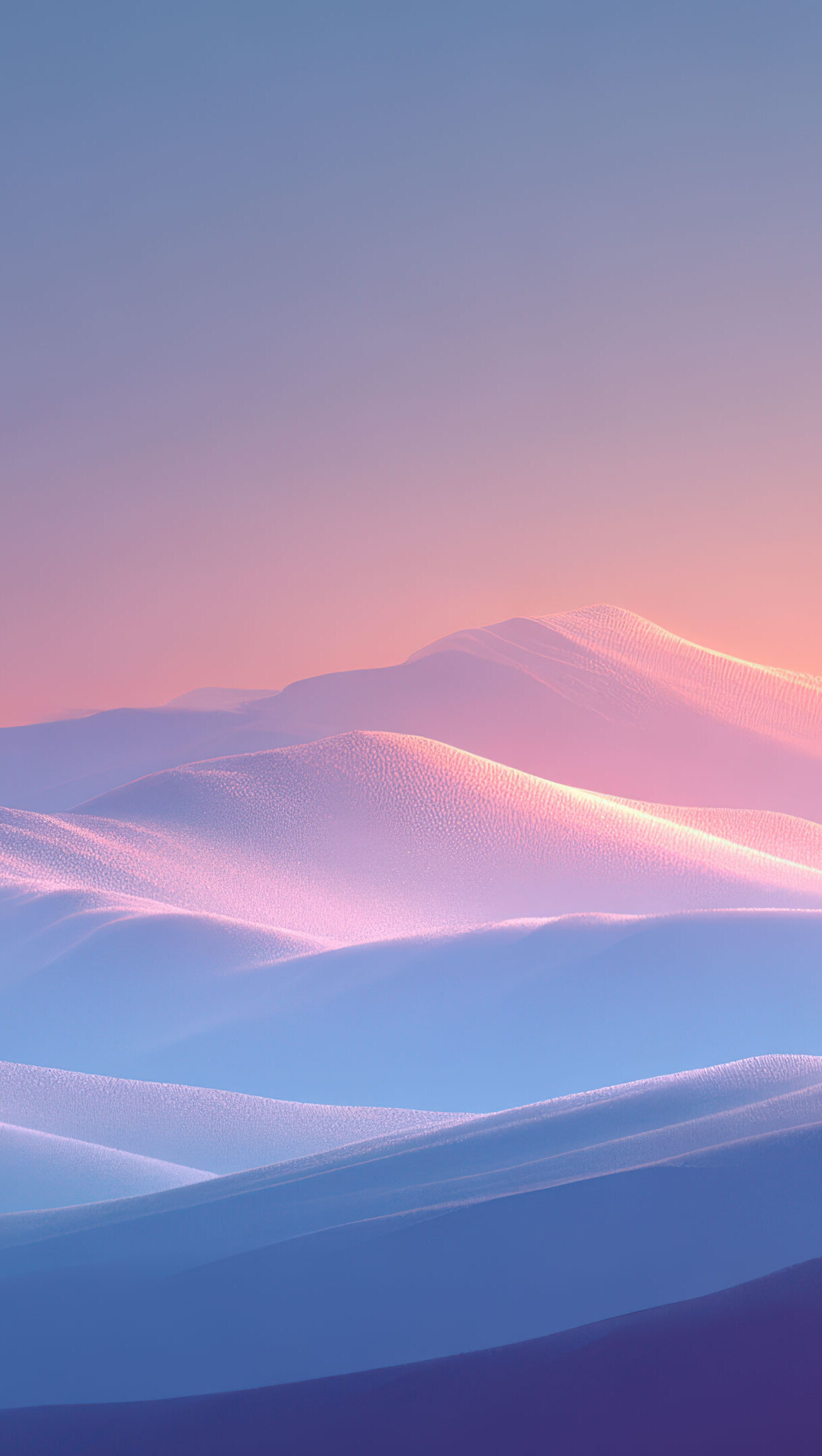 An otherworldly 4K wallpaper showcasing soft, undulating mountains extending across a serene, dreamlike landscape. The scene is defined by a captivating pastel gradient that shifts from cool blues to warm pinks, with soft light illuminating the peaks in a delicate, shimmering texture.