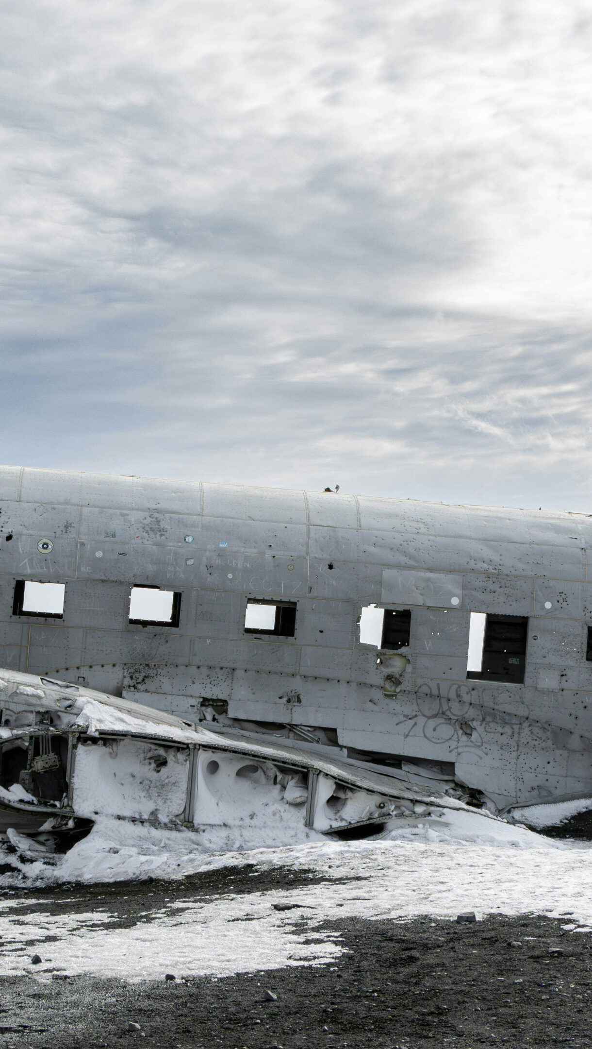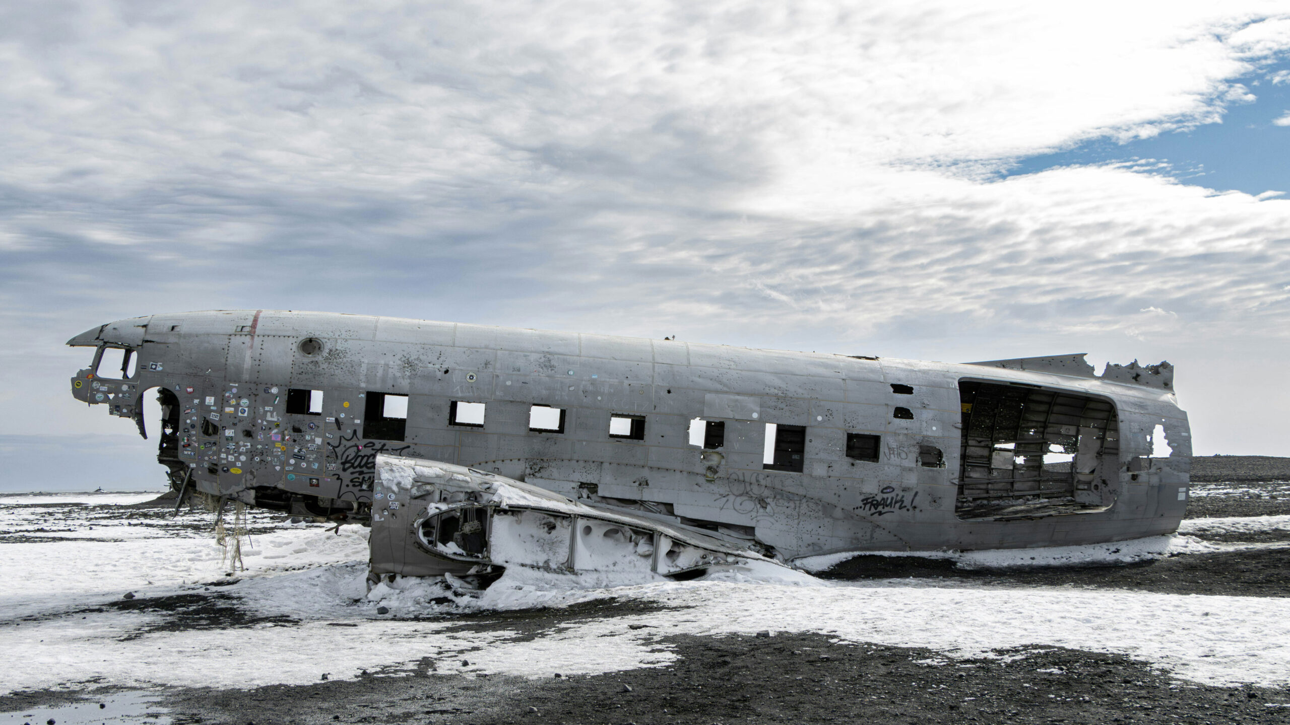A breathtaking 4K wallpaper captures the Solheimasandur plane wreck amidst a winter landscape. The abandoned airplane lies frozen in time, surrounded by pristine snow and icy terrain, creating a dramatic and atmospheric scene. Perfect for adorning your desktop or mobile screen with a stunning winter vista.