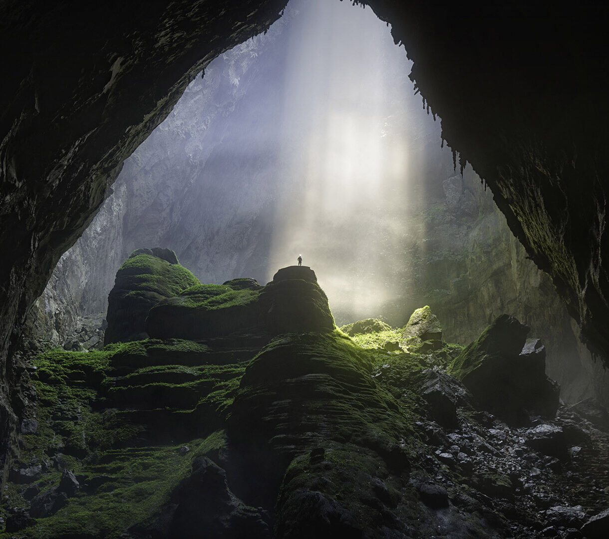 A breathtaking 4K wallpaper capturing the vast, moss-covered interior of Sơn Đoòng Cave in Vietnam, with a lone figure standing beneath a huge natural opening. Dramatic sunbeams pierce through the misty cavern opening, illuminating vibrant green moss on the colossal rock formations and creating an ethereal, awe-inspiring scene.