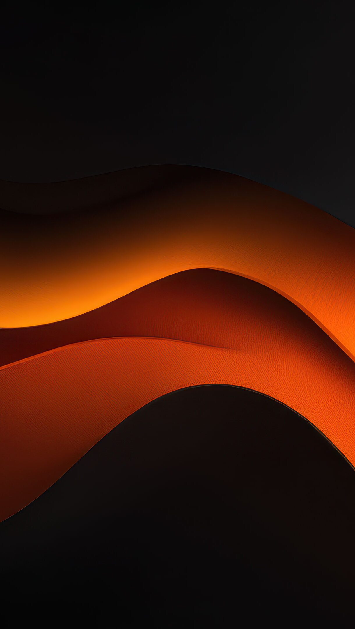 An elegant 4K wallpaper showcases sophisticated abstract waves, gracefully flowing in shades of vibrant orange, warm amber, and deep black across the entire display. The smooth, organic curves create a captivating dance of light and shadow, revealing subtle textures that enhance the modern and refined mood.