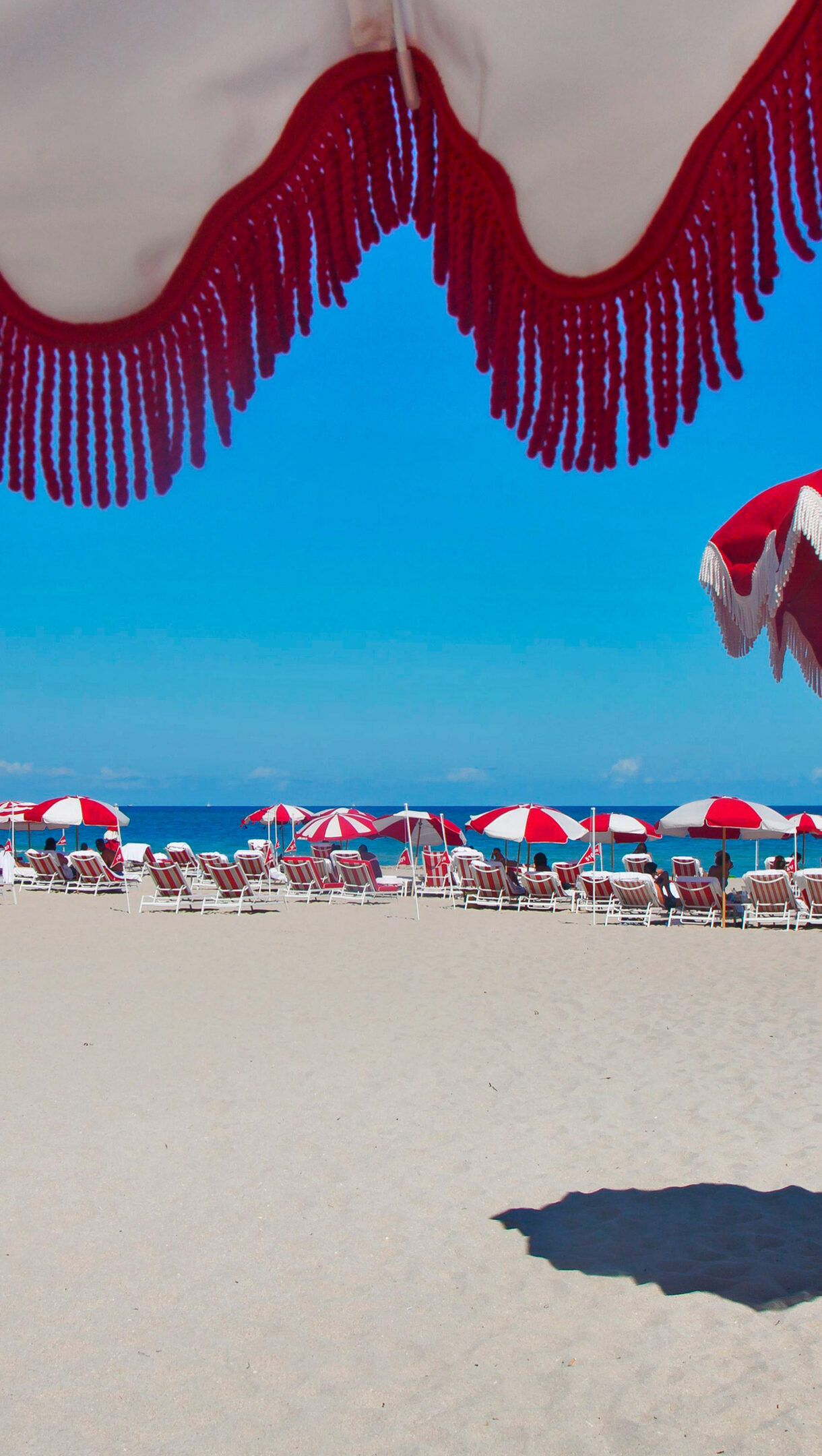 An iconic 4K wallpaper presents South Beach, Miami Beach, Florida, bustling with red and white umbrellas and lounge chairs lining the vast sandy beach stretching to the clear blue ocean. The striking red and white patterns of the umbrellas create a cheerful rhythm across the sun-drenched sand, vividly contrasted by the brilliant blue sky and calm ocean waters.