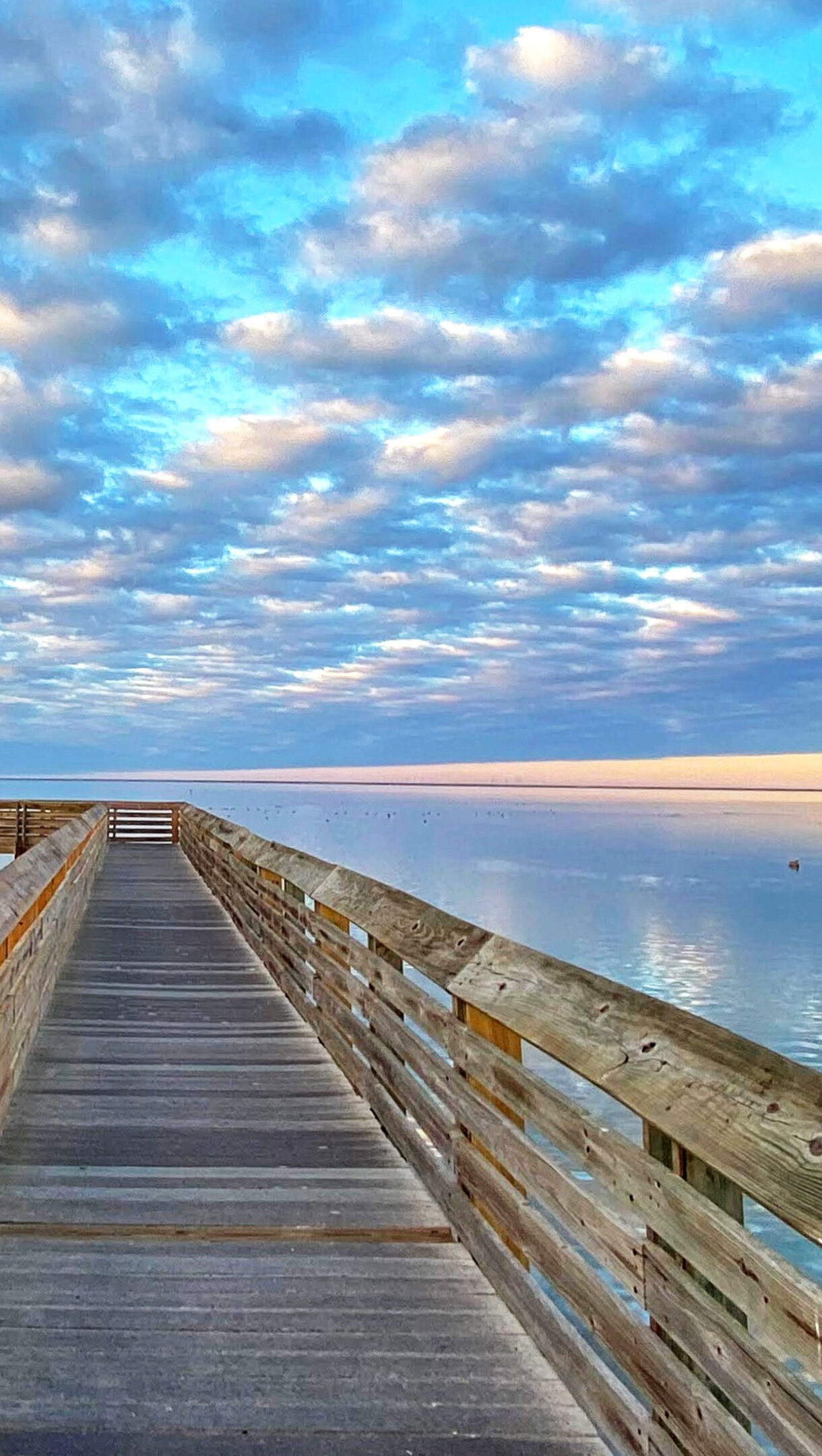 A mesmerizing 4K wallpaper showcasing a long wooden pier extending into the calm waters of South Padre Island, Texas. The sunset sky, filled with layered blue and soft golden clouds, casts a serene glow that reflects beautifully across the tranquil water, enhancing the scene's peaceful mood.