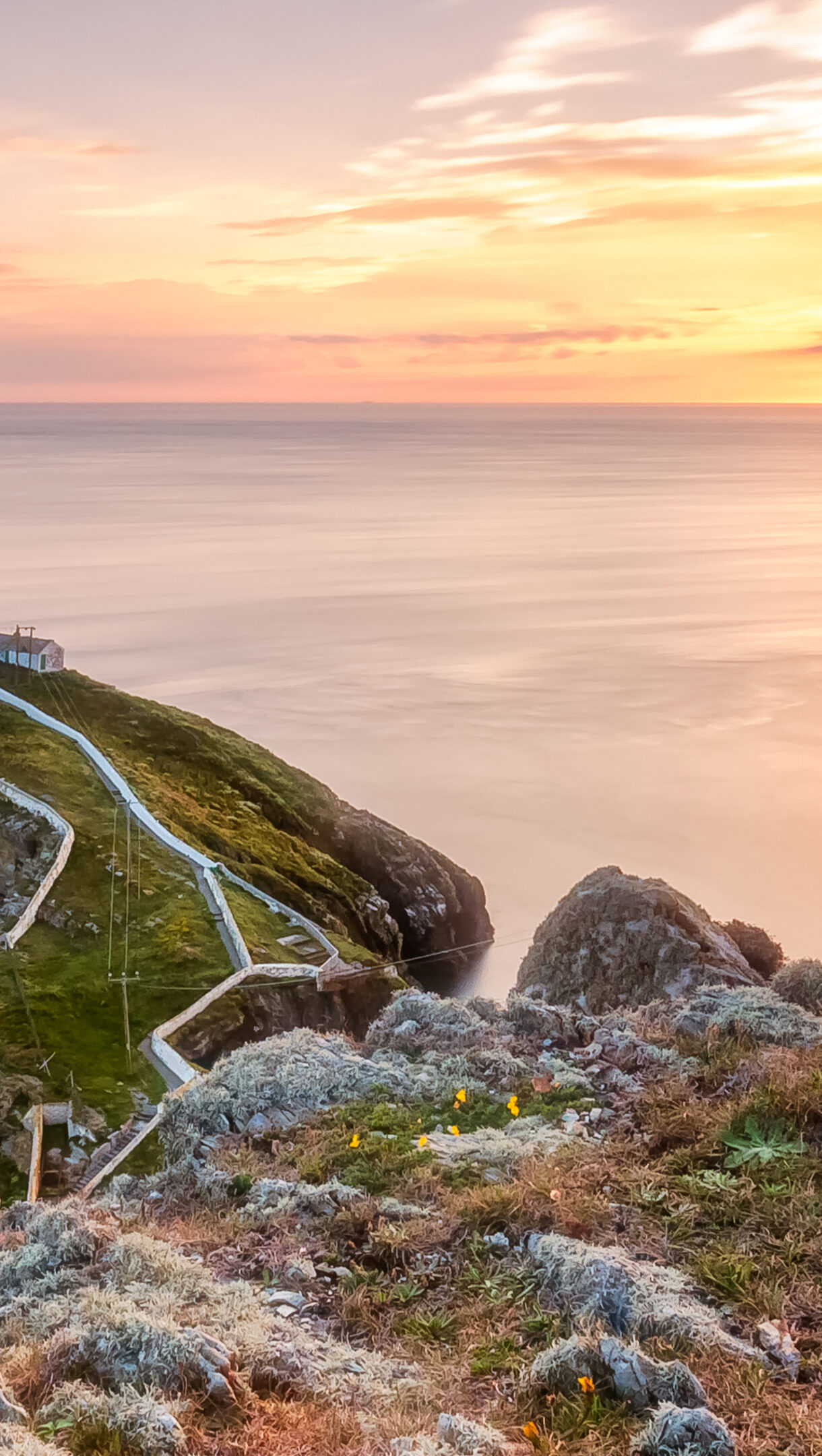 An awe-inspiring 4K wallpaper capturing the iconic South Stack Lighthouse perched on a rugged island cliff off Holy Island, Wales. The tranquil sea reflects the vibrant orange and pink hues of the sunset, creating a breathtaking and serene coastal landscape.
