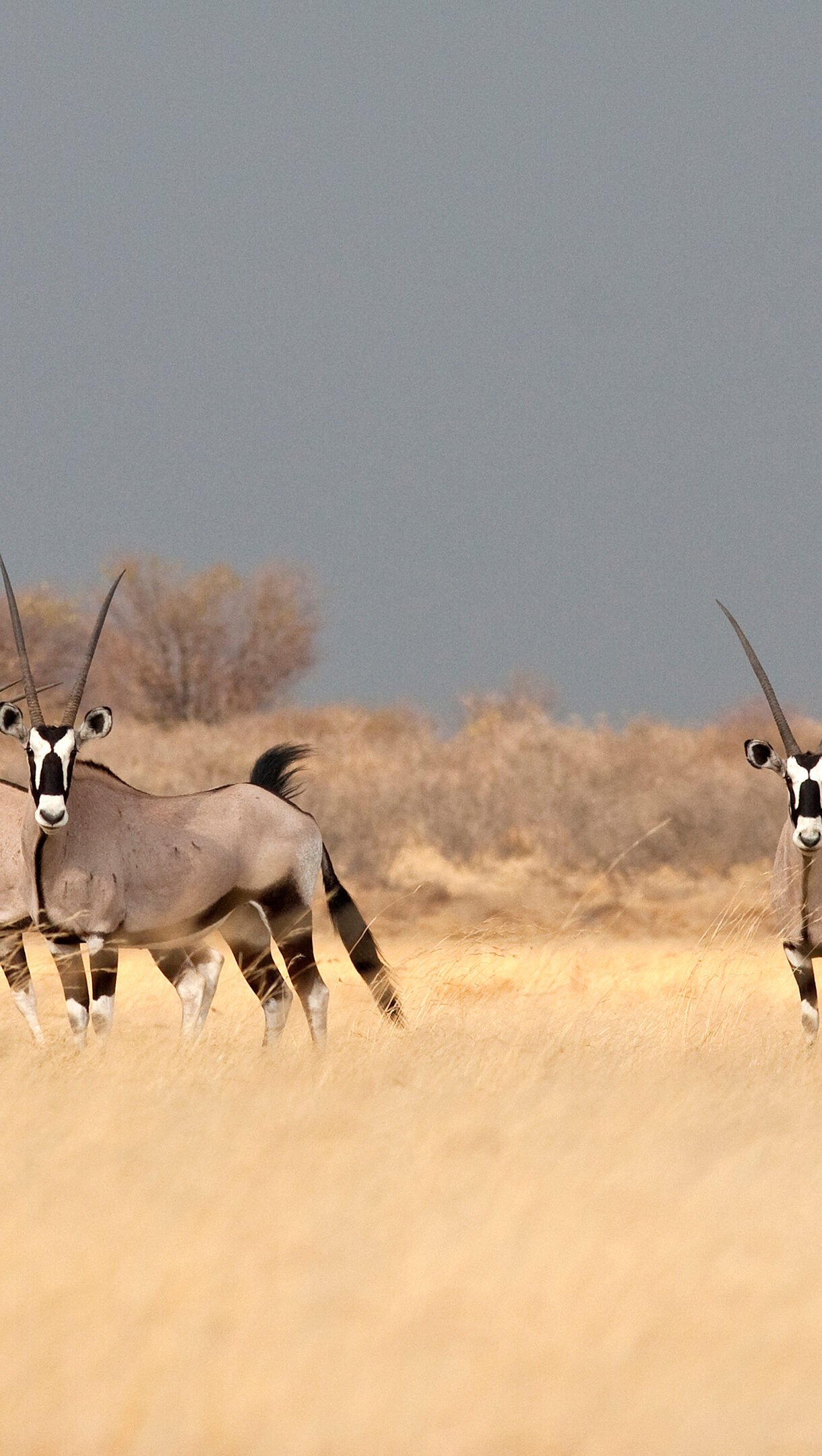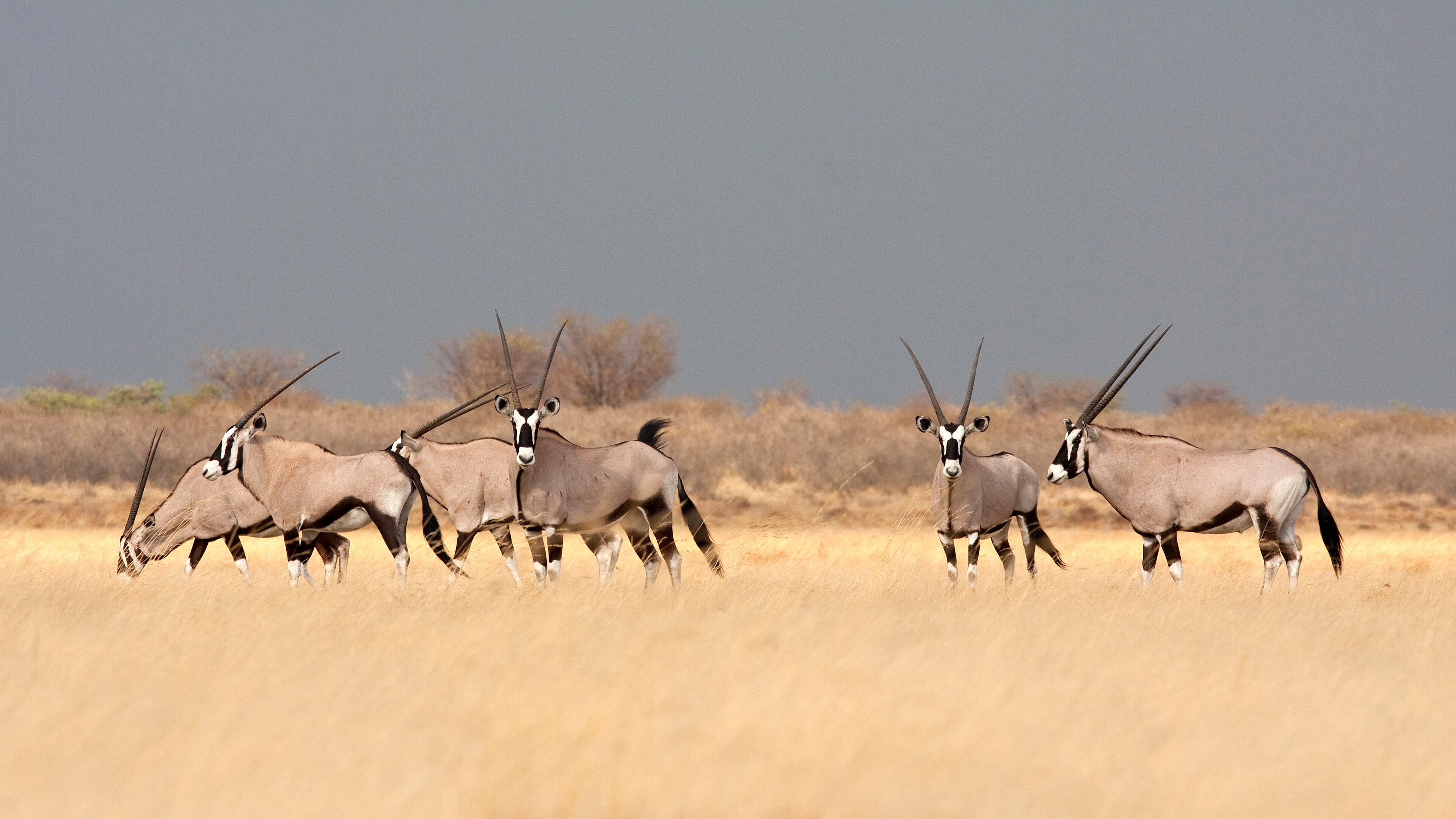 A breathtaking 4K wallpaper presents a tranquil Southern Gemsbok herd traversing a vast, golden savanna landscape. Their distinctive black and white facial markings and elegant horns stand out against the muted sky and sun-kissed dry grasses, capturing the serene beauty of the wild.
