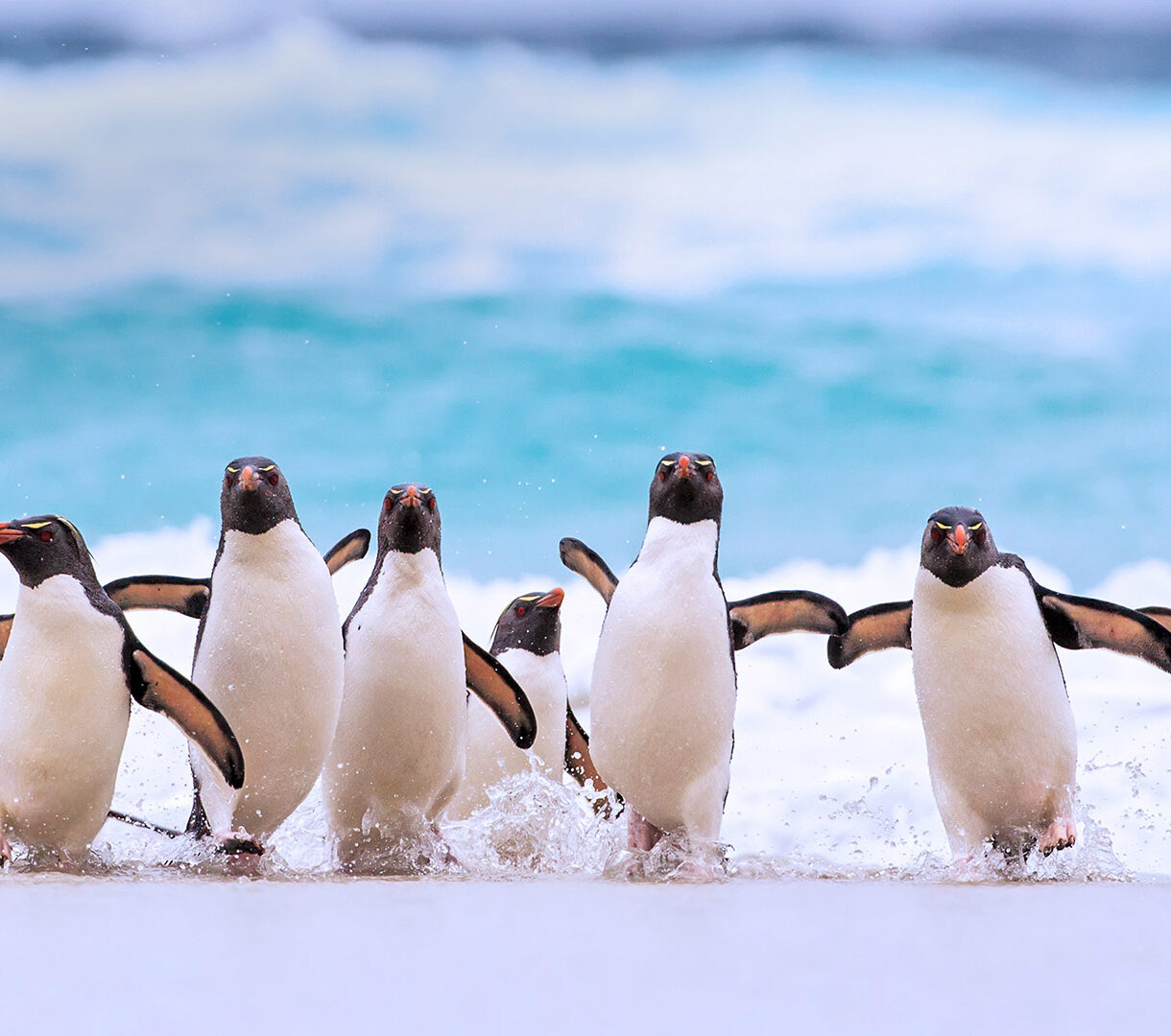 A captivating 4K wallpaper showcases a lively group of Southern Rockhopper Penguins waddling ashore from the vivid turquoise ocean onto a sandy Falkland Islands beach. The energetic splash of waves around their feet highlights their distinctive orange beaks and spiky yellow crests, conveying a dynamic natural scene.