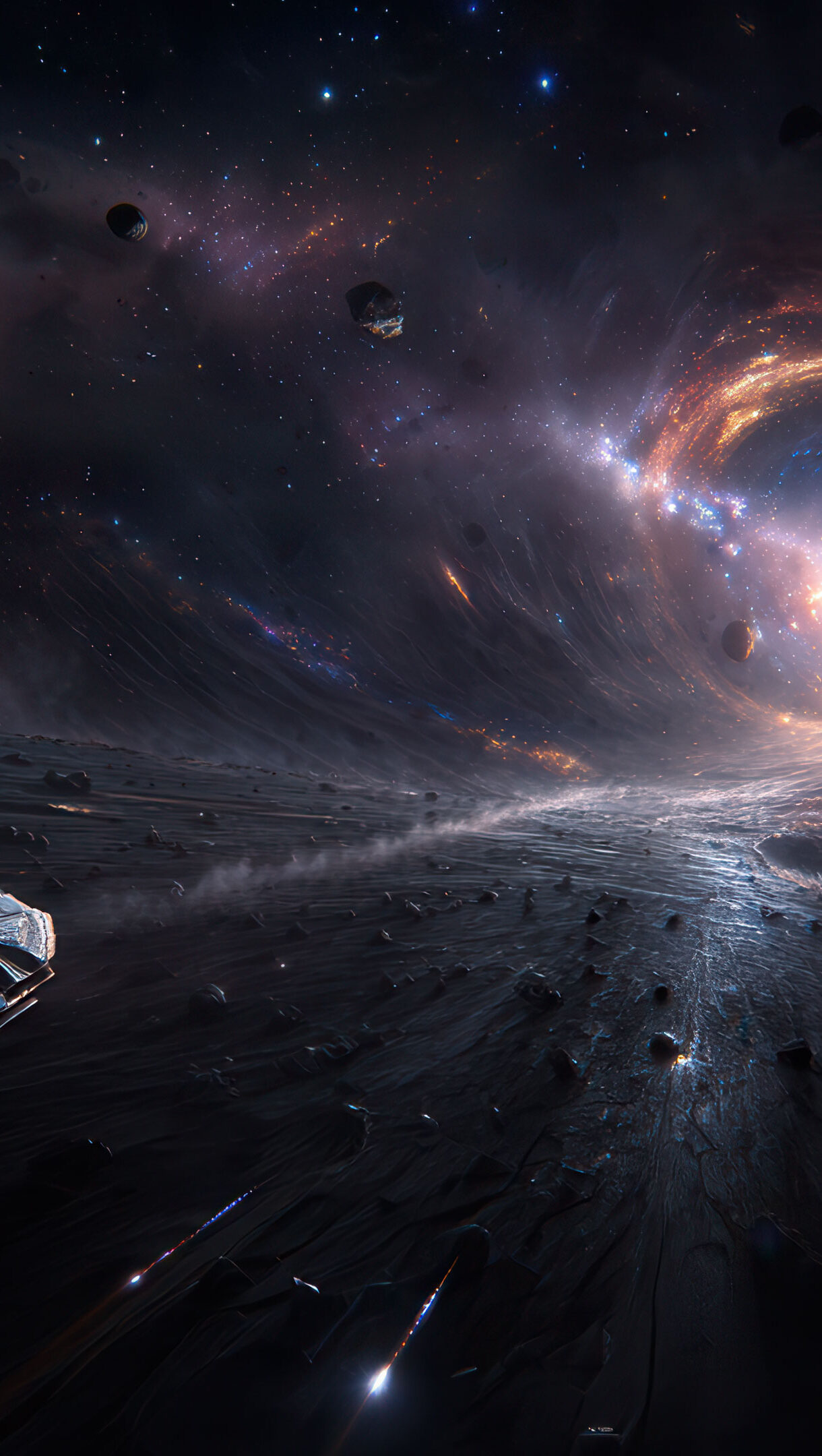 A breathtaking 4K wallpaper presents a sleek spaceship with glowing orange engines flying low over a dark, cratered alien landscape, intently approaching a magnificent, swirling cosmic vortex in the deep, star-studded expanse. The luminous vortex pulsates with an intense core of white and golden light, expanding into vibrant rings of orange, red, and blue nebulae, creating a powerful and awe-inspiring gateway.