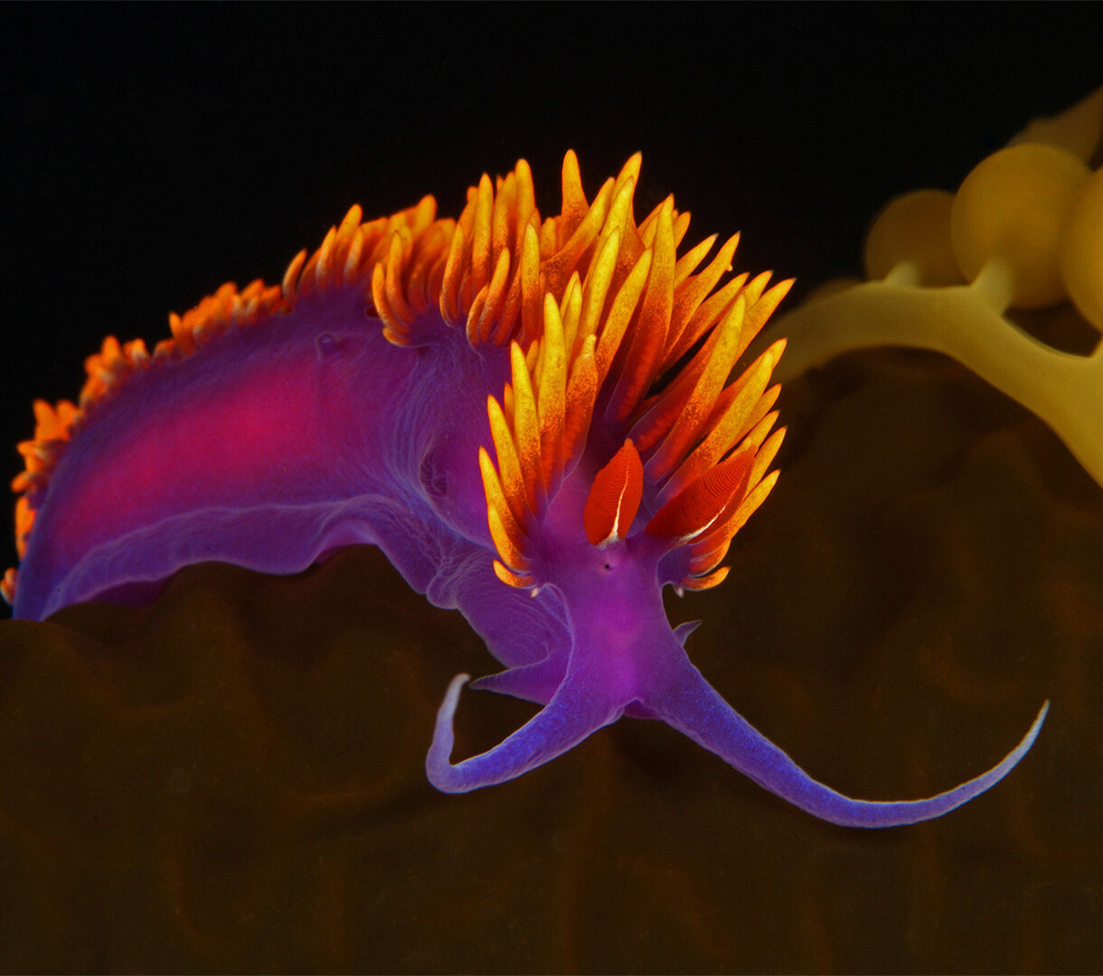 A captivating 4K wallpaper presents a Spanish Shawl Nudibranch nestled on kelp off Santa Catalina Island. Its vibrant fuchsia and purple body, adorned with fiery orange cerata, vividly stands out against the dark aquatic backdrop and soft golden kelp fronds.