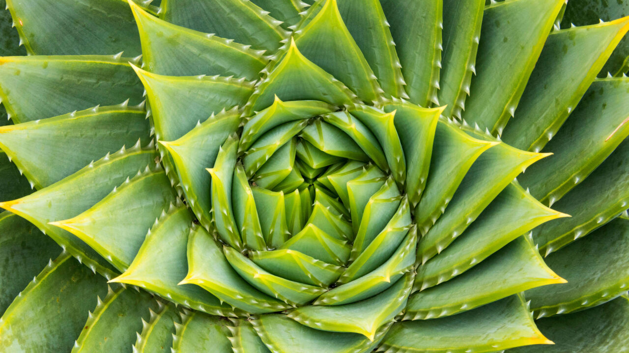 A vibrant 4K wallpaper showcasing a magnificent Spiral Aloe plant from Kangaroo Island, captured in a detailed top-down view. Its tightly packed, succulent green leaves form a mesmerizing geometric spiral, accentuated by luminous yellow-green edges and tiny, sharp white spines.