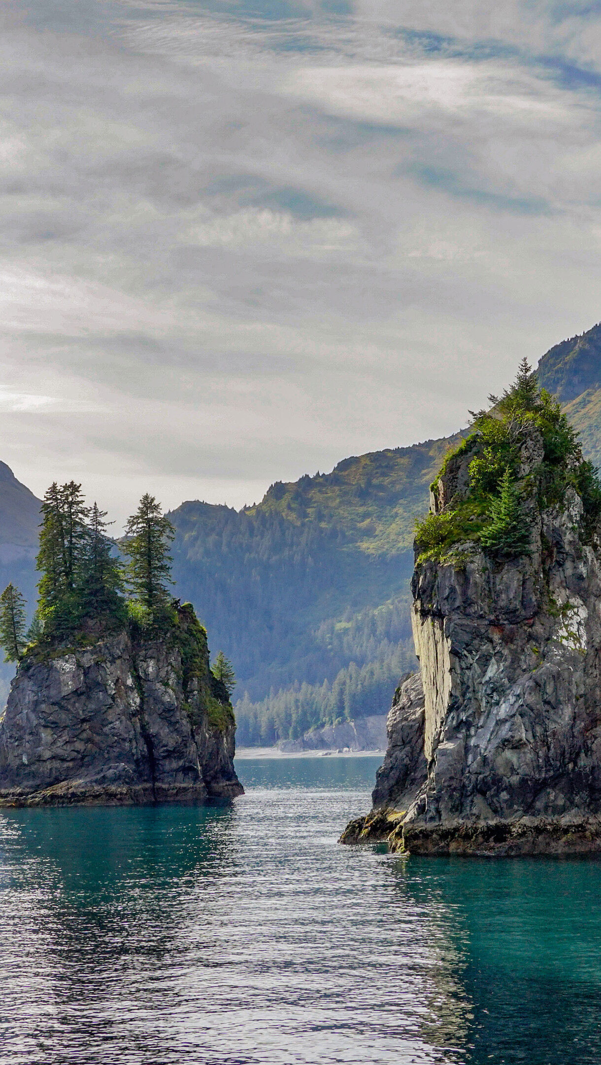 An immersive 4K wallpaper showcasing the magnificent Spire Cove Sea Stacks rising dramatically from the turquoise waters of Kenai Fjords National Park, Alaska. Their rugged, tree-covered forms pierce a soft, cloudy sky, creating a majestic panorama of wild Alaskan beauty.