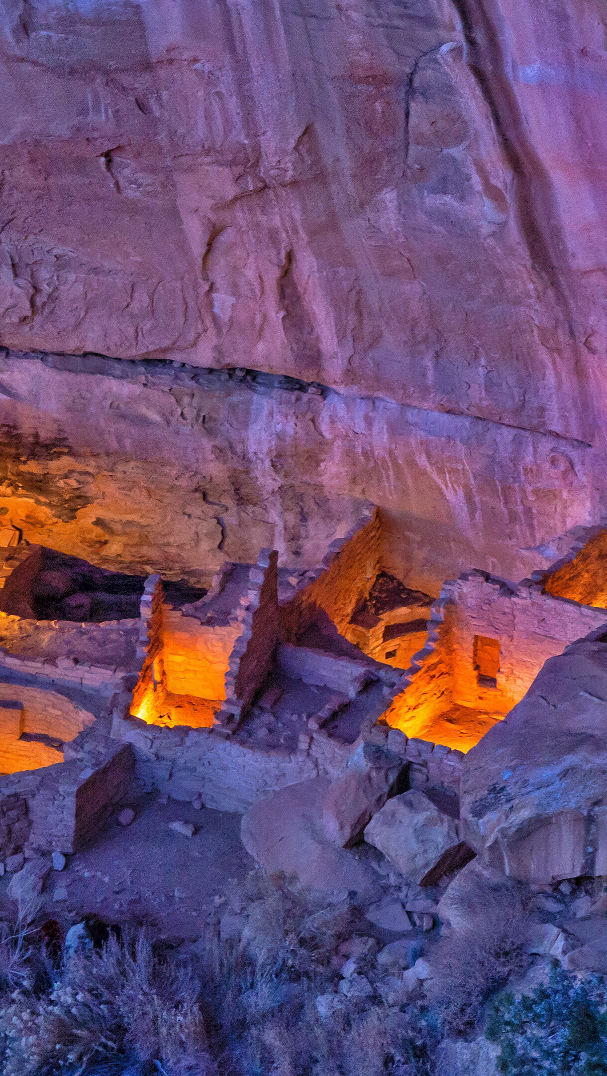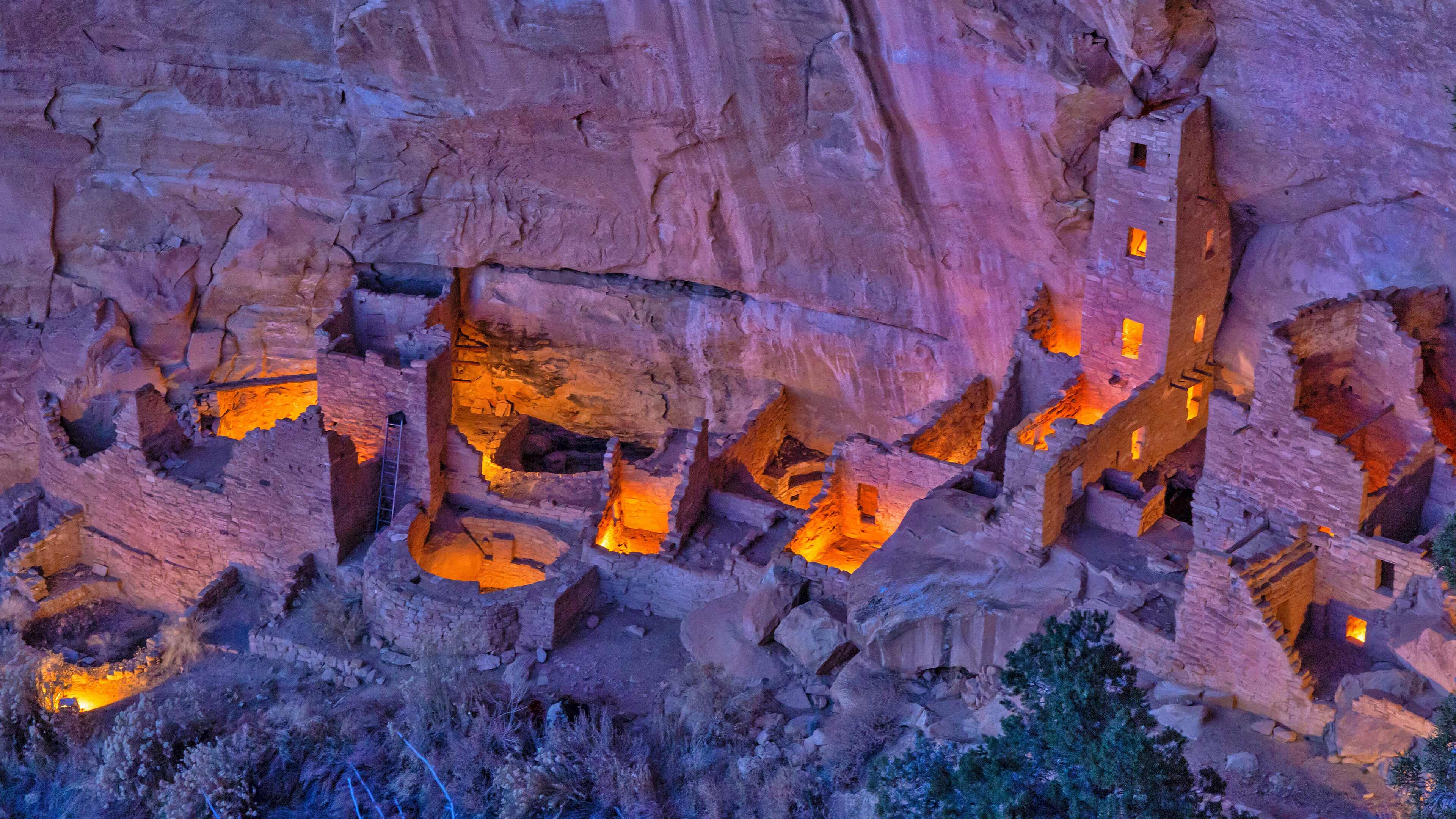 A captivating 4K wallpaper showcasing Square Tower House, an ancient cliff dwelling in Mesa Verde National Park, Colorado, illuminated at night. The soft orange glow from within the stone structures creates a dramatic contrast with the deep purple and blue tones of the surrounding rock face, highlighting the site's historical depth and nighttime mystique.