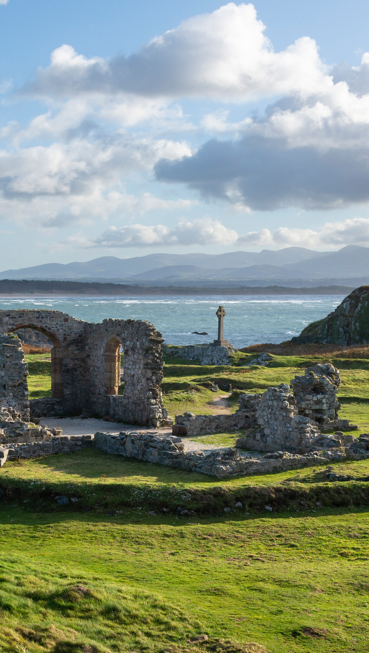 An evocative 4K wallpaper presenting the ancient stone ruins of St Dwynwen's Church nestled in the vibrant green coastal landscape of Ynys Llanddwyn, Wales. Brilliant sunlight dramatically highlights the historic stones and verdant fields, creating a sense of serene grandeur against the windswept sea and distant, hazy mountains.