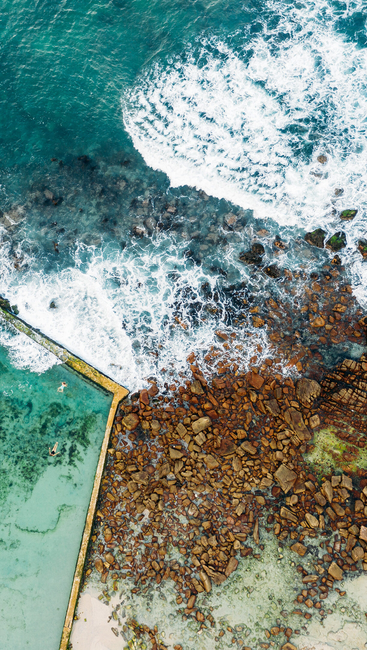 A captivating 4K wallpaper showcasing the St. James Tidal Pool in Cape Town, South Africa, from an aerial ocean view. The vibrant turquoise water of the pool, where a few people swim, sharply contrasts with the wild, white-foamed ocean crashing against the rugged, rust-toned coastline.