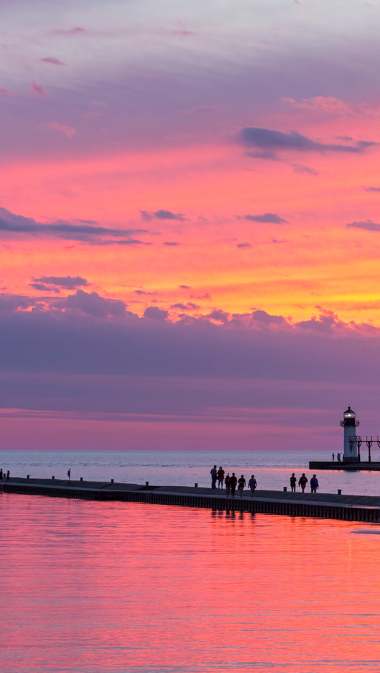 A breathtaking 4K wallpaper showcasing the St. Joseph North Pier with its Inner and Outer Lights extending into the tranquil water, where people stroll along the long pier. The dramatic pink and orange sunset paints the sky and reflects intensely on the water, creating a serene and captivating evening atmosphere.