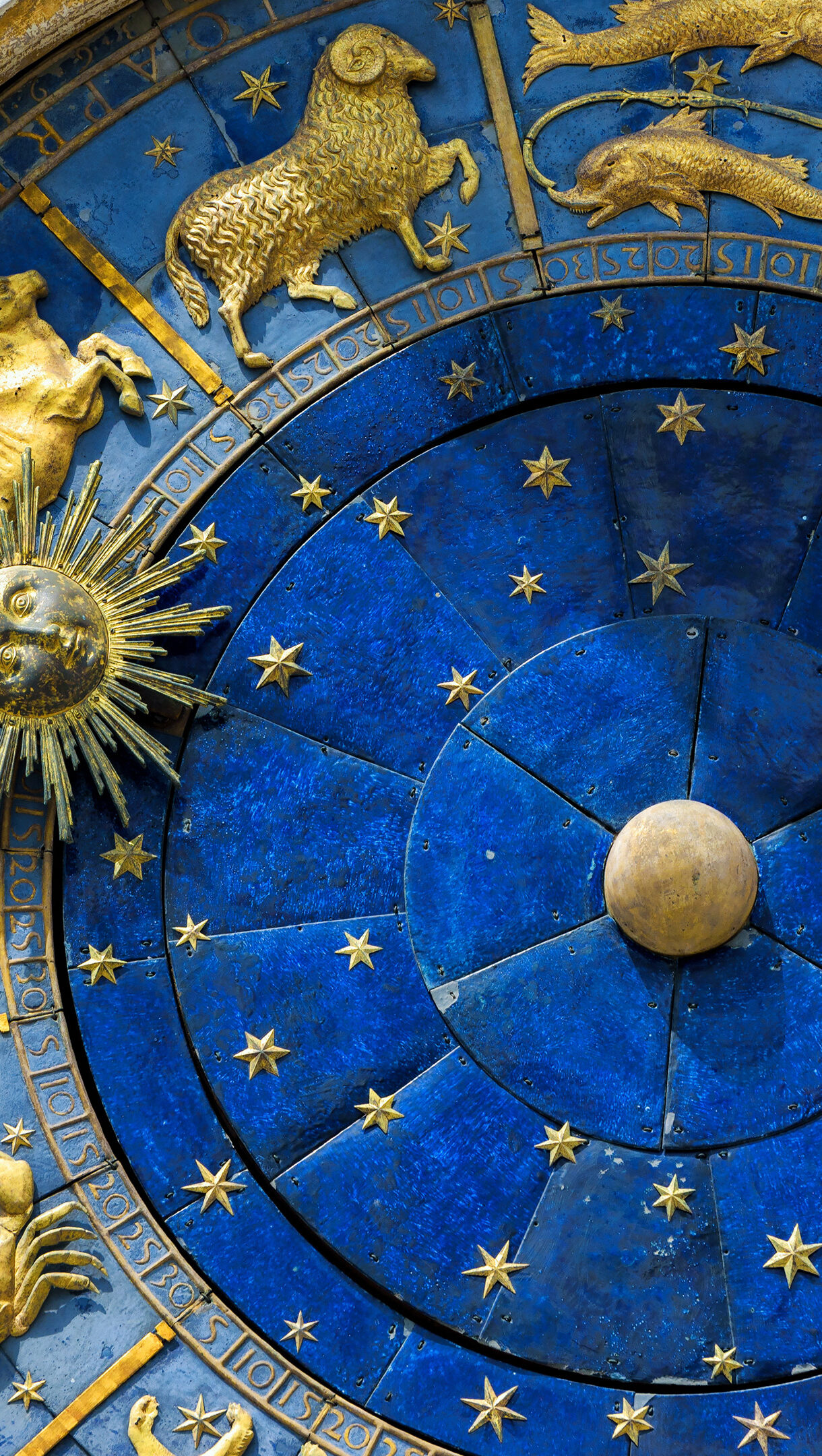 A captivating 4K wallpaper presents a detailed close-up of the astronomical dial on St. Mark's Clock Tower in Venice, Italy. Golden zodiac figures and constellations stand out against the deep lapis lazuli blue of the central dial, beautifully illuminated to showcase its intricate historical craftsmanship.
