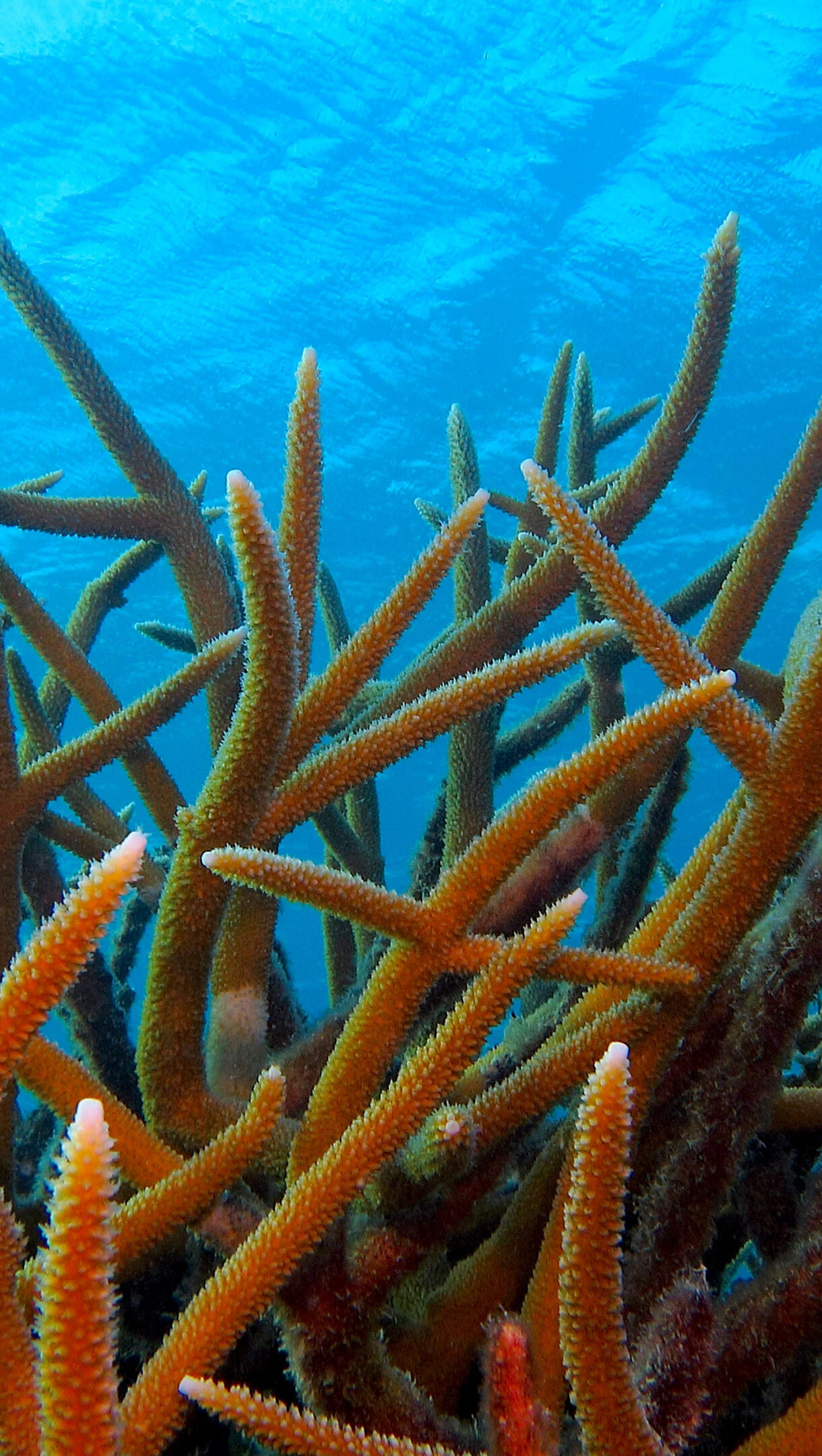 An immersive 4K wallpaper showcasing vibrant orange Staghorn coral flourishing in the clear blue waters of Bonaire. The coral's intricate, pointed branches contrast beautifully with the shimmering patterns of light on the water's surface above.