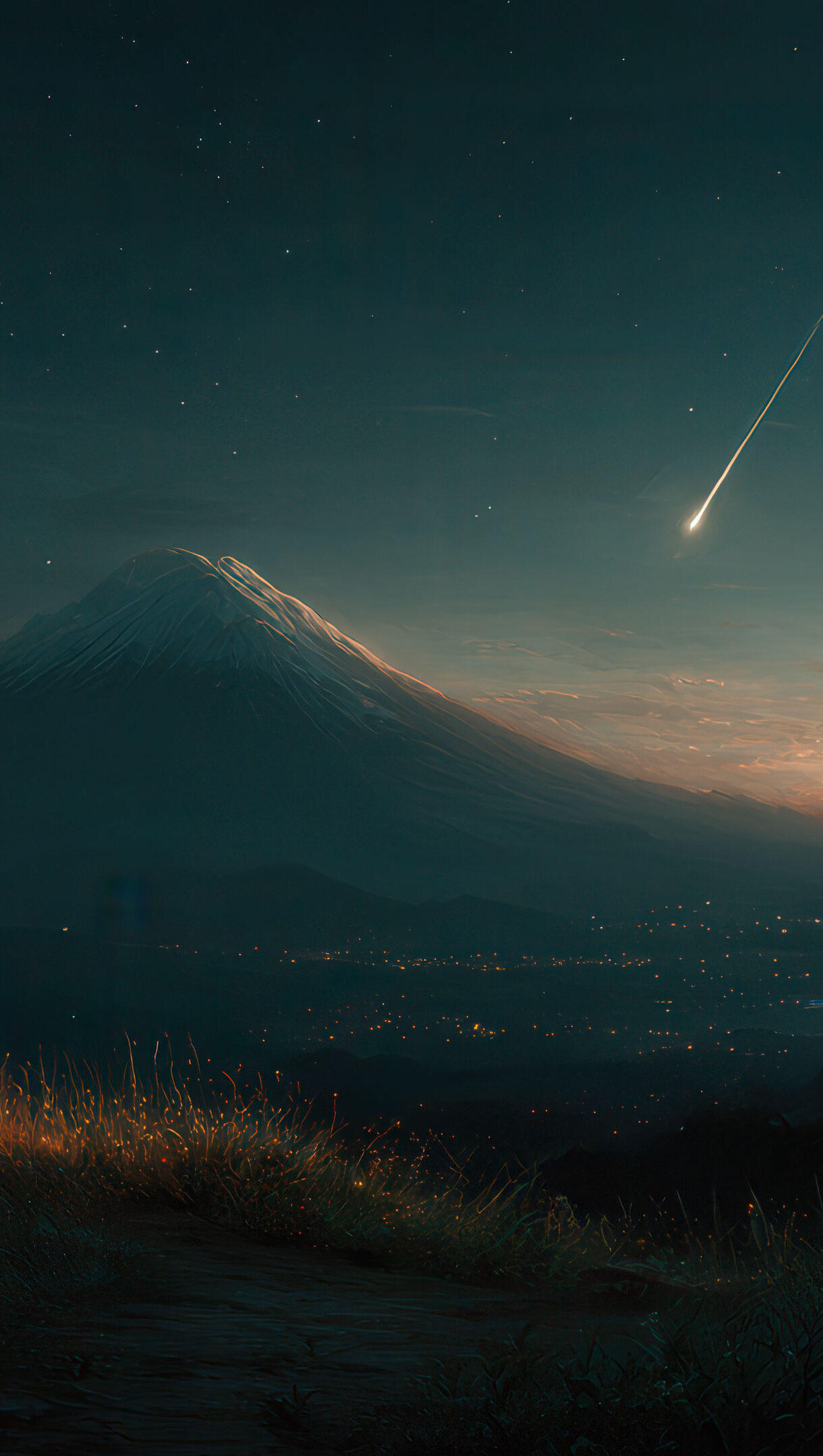 An awe-inspiring 4K wallpaper capturing a person and their dog sitting together on a grassy hillside, gazing out at a majestic, snow-capped mountain range and a twinkling city below under the night sky. A brilliant meteor streaks across the starry expanse, adding a dramatic sense of wonder to the serene scene illuminated by the soft glow of distant city lights and a subtle, warm horizon.