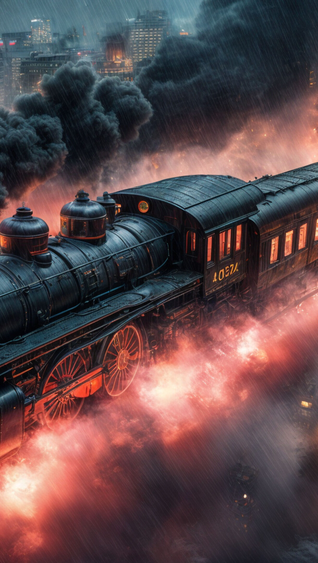 A stunning 4K wallpaper featuring a steam train traversing a cityscape at night. The glowing city lights illuminate the train's path, creating a striking contrast against the dark sky. The vintage steam train adds a nostalgic charm to the modern urban backdrop, perfect for enhancing your desktop or mobile wallpaper.