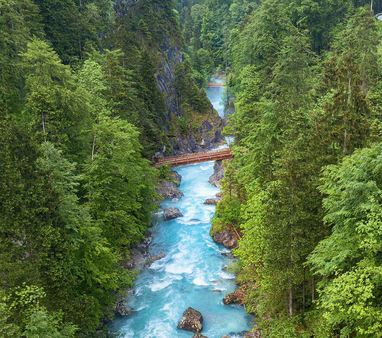 A breathtaking 4K wallpaper presenting the Steyr River flowing through a deep gorge in an Austrian forest landscape, spanned by a rustic wooden bridge. The river's vivid turquoise water, with its foamy rapids, dramatically contrasts with the rich, verdant hues of the surrounding dense woodland and rugged cliffs.