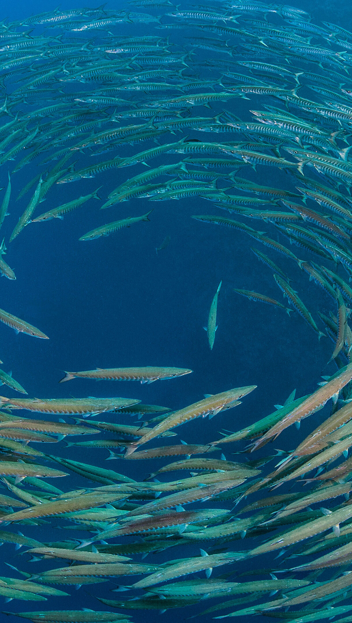 A mesmerizing 4K wallpaper showcasing a massive school of Blackfin Barracuda spiraling into a striking vortex within the deep blue waters of the Sinai Peninsula. The uniform movement of their sleek, silvery bodies creates a breathtaking, dynamic pattern, brilliantly illuminated by the ambient light of the ocean.