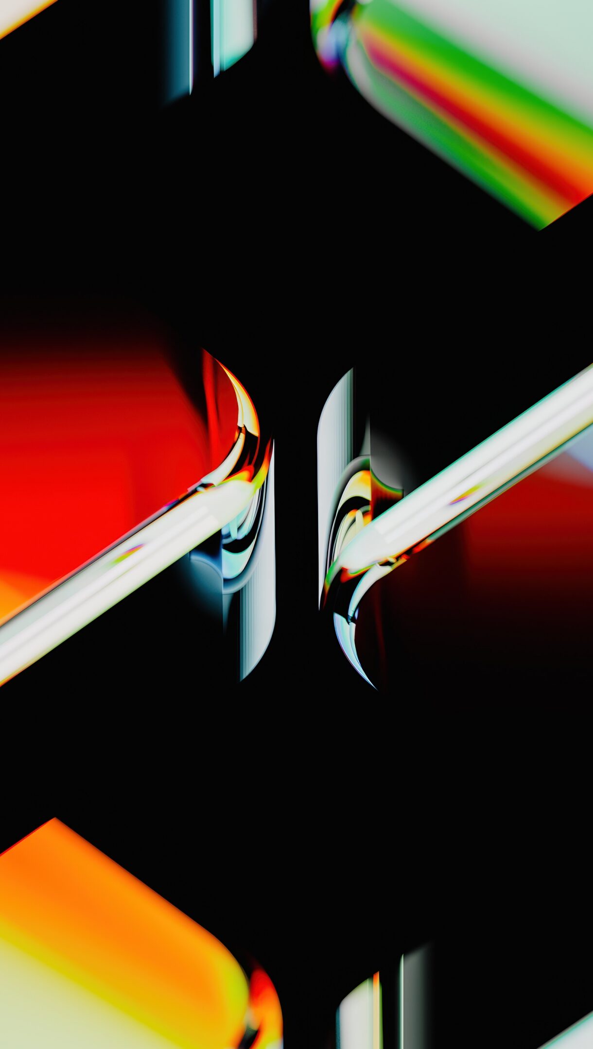 A dazzling 4K wallpaper presenting an abstract composition of luminous glass-like forms against a deep black background. Its mesmerizing design highlights the complex interplay of light, creating vivid refractions of red, orange, green, and blue hues that flow and bend dramatically across the scene, defining a dynamic and visually rich mood.