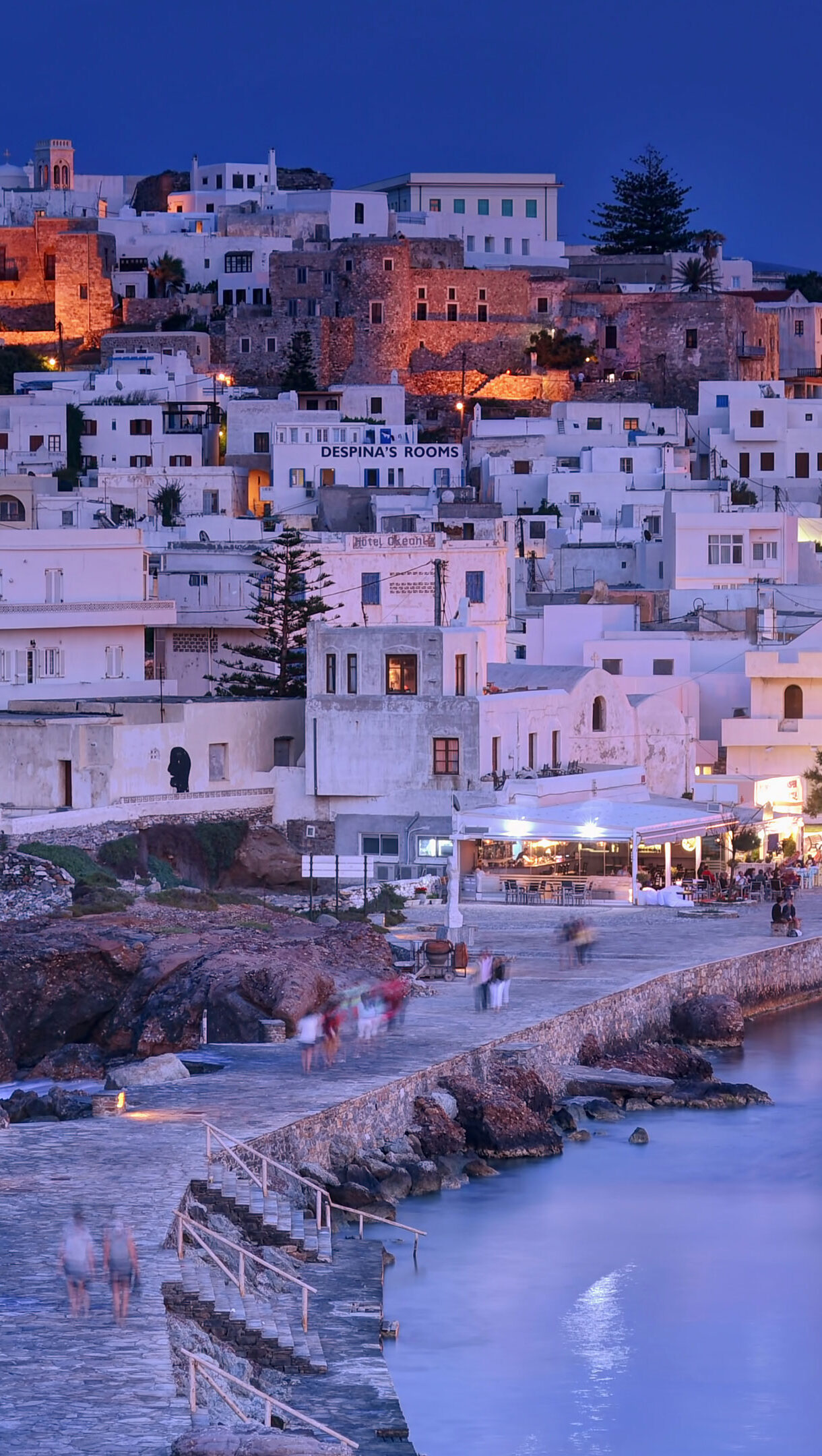 A breathtaking 4K wallpaper capturing the enchanting Naxos town in the Cyclades, Greece, nestled on a hillside overlooking the Aegean Sea during the blue hour. The striking contrast between the warm, glowing lights of the traditional white buildings and the deep indigo sky creates a truly magical and inviting atmosphere along the lively waterfront.