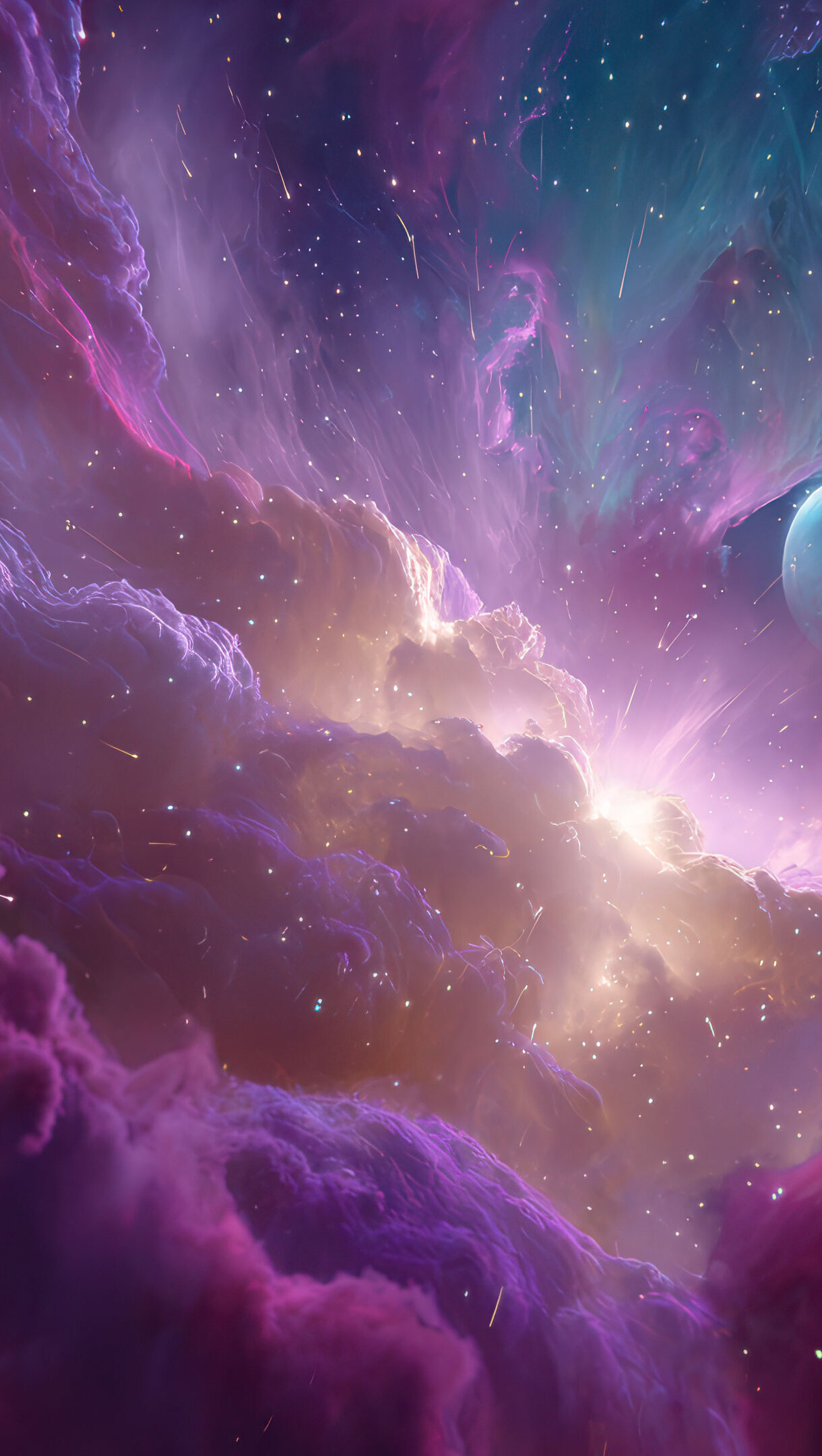 A breathtaking 4K wallpaper reveals a vast, luminous nebula swirling with gas and dust in deep space, illuminated by countless stars and a distant pale blue planet. A brilliant golden core radiates through the nebula's vibrant purple, pink, and teal clouds, creating a dynamic and ethereal cosmic spectacle with streaking meteor trails.