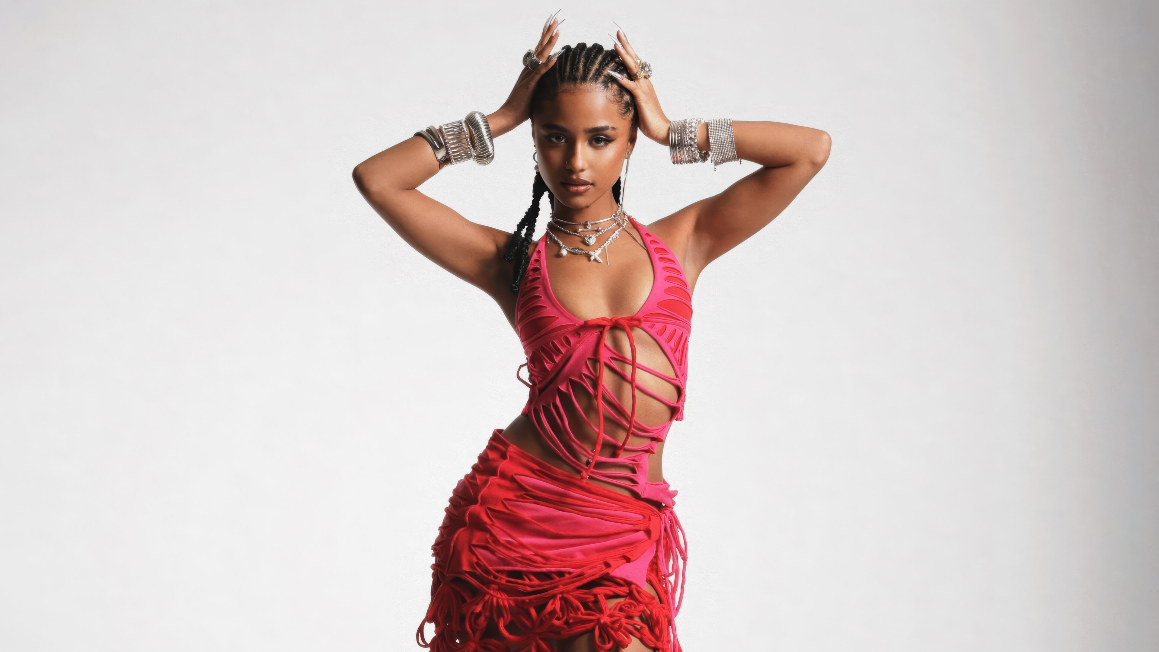 A captivating 4K wallpaper features Tyla, the celebrity, striking a dynamic pose against a minimalist white backdrop. Her stunning pink dress with intricate cutouts, complemented by an array of bold silver jewelry, perfectly accentuates her confident and stylish presence.