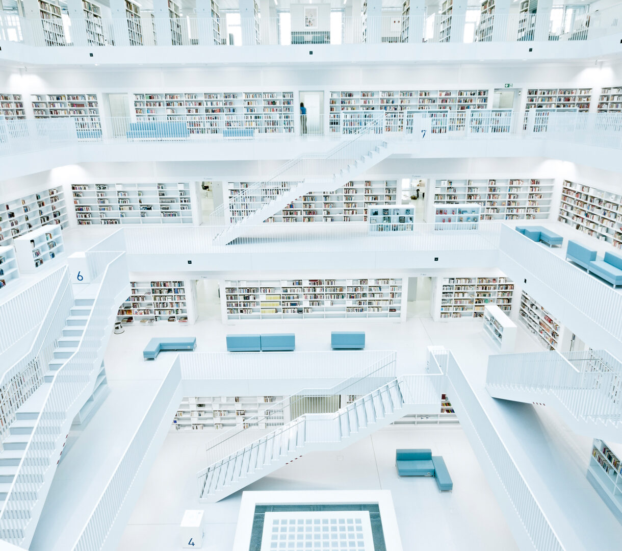A striking 4K wallpaper presents the multi-tiered, stark white interior of the modern Stuttgart Public Library in Germany. Its grand, labyrinthine design features countless bookshelves filled with colorful volumes, interconnected by immaculate white staircases and minimalist blue seating, creating a serene, luminous atmosphere.