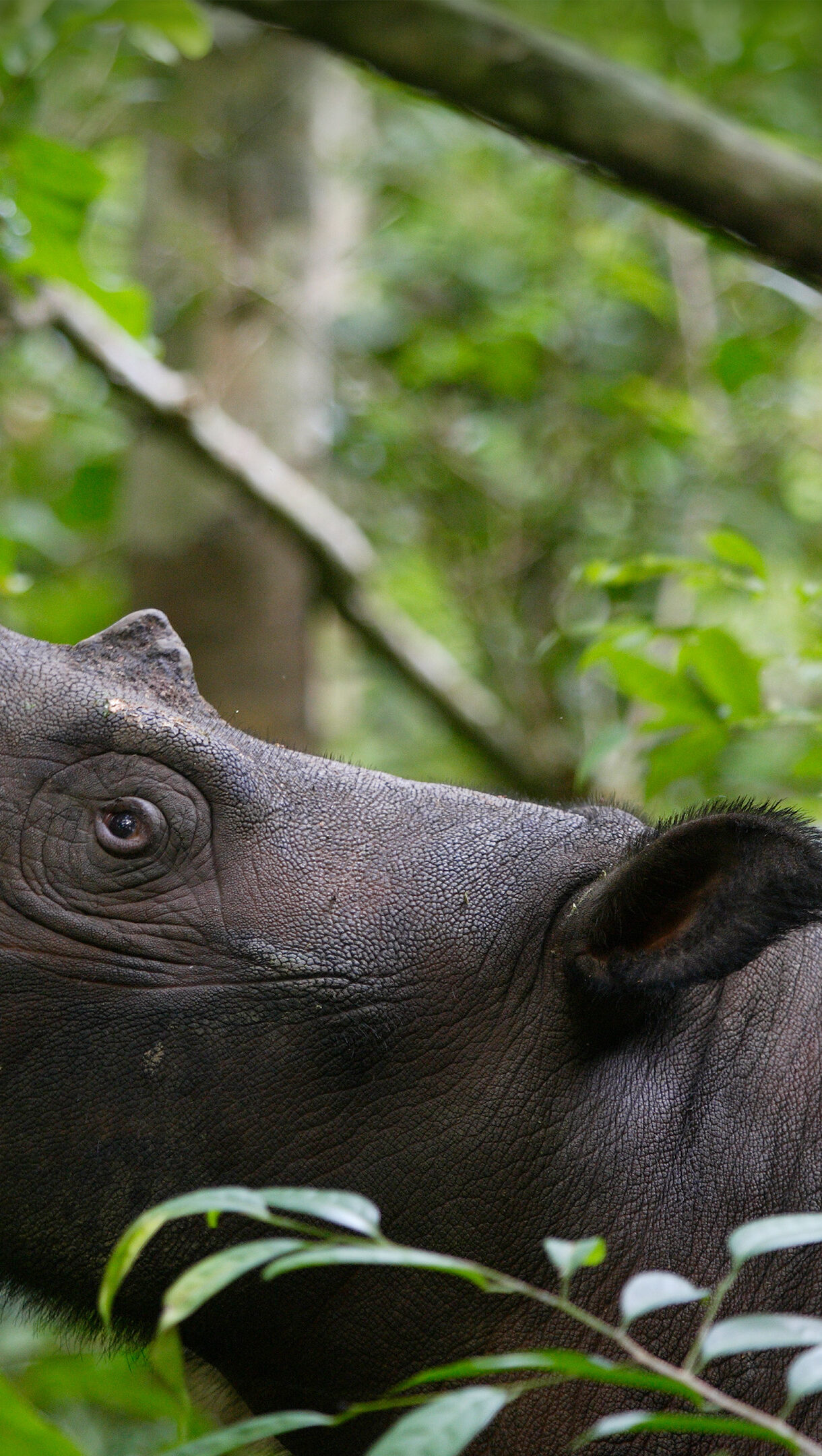 A detailed 4K wallpaper showcasing a Sumatran Rhinoceros female delicately eating leaves within a dense, verdant forest. Its wrinkled, dark grey skin contrasts richly with the vibrant green leaves it nibbles, highlighted by the soft, diffused light of the forest canopy.
