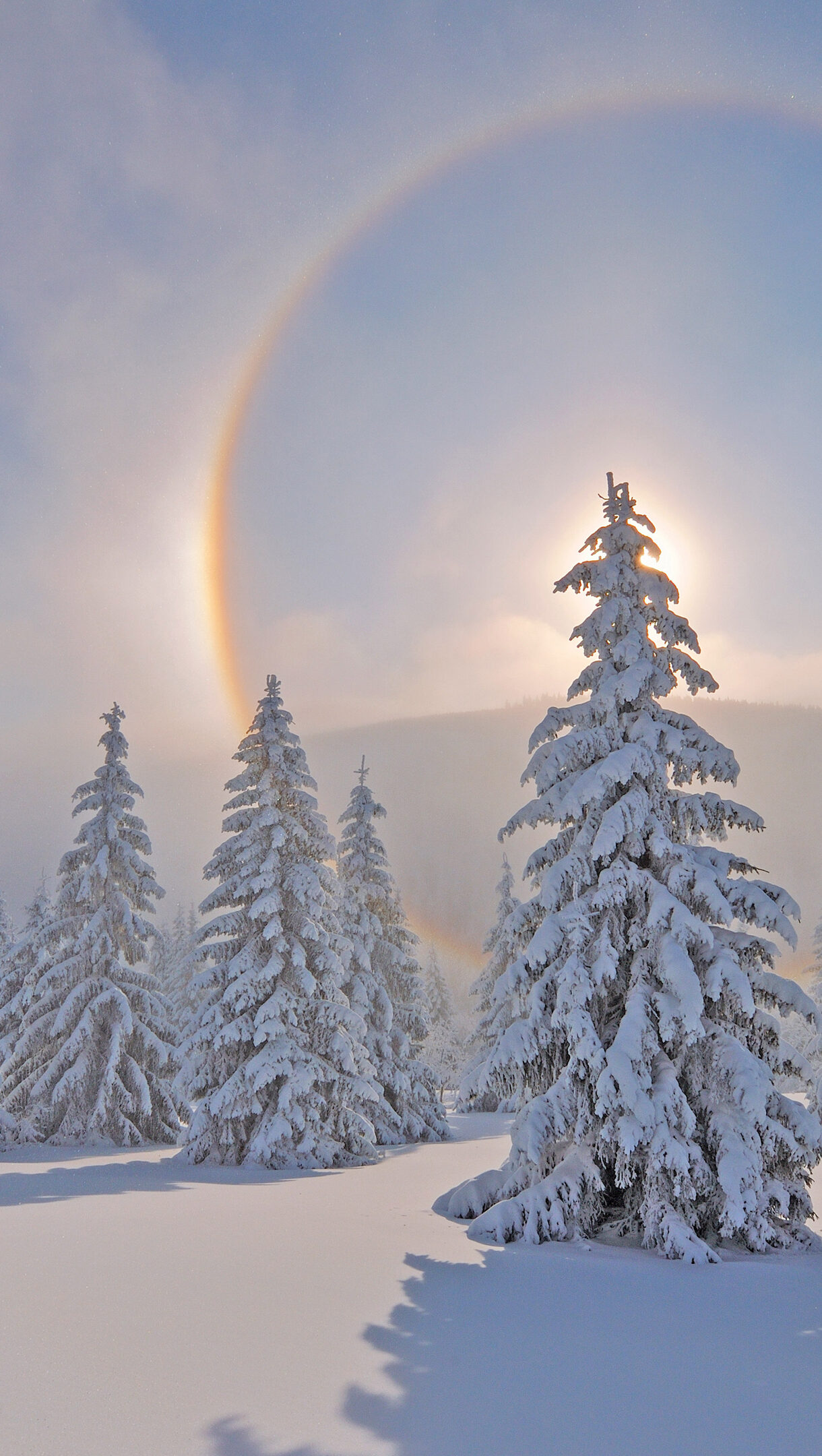 A magical 4K wallpaper captures a breathtaking winter scene in the Ore Mountains, Saxony, Germany, featuring a majestic sun halo arching over snow-covered fir trees. The sun, partially obscured by a central tree, creates a brilliant glow that illuminates the vibrant colors of the halo and casts long, crisp shadows across the pristine white snow, evoking a serene and enchanting winter wonderland.