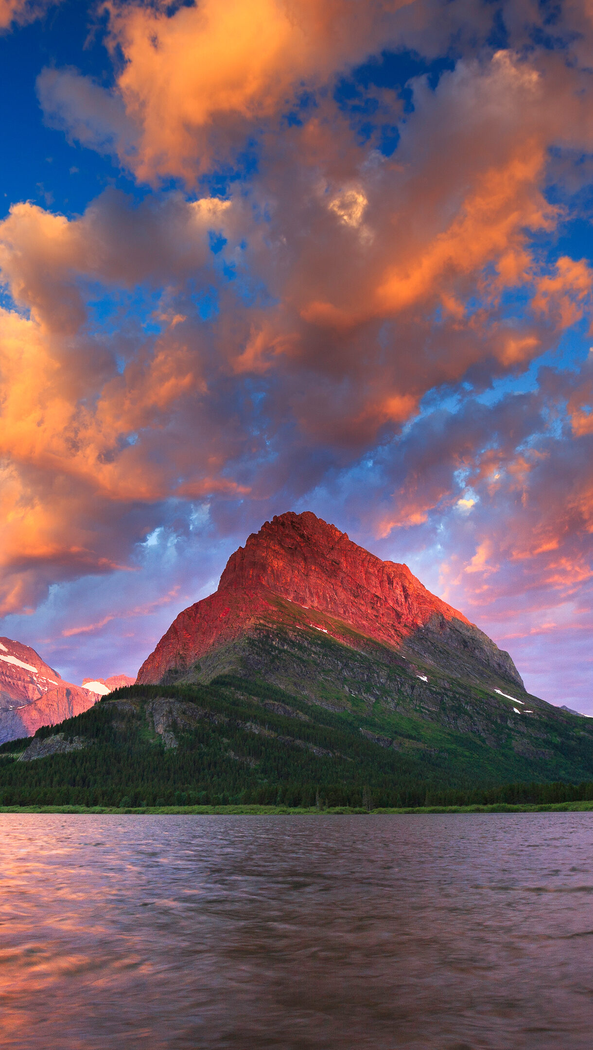 A breathtaking 4K wallpaper featuring a dramatic sunrise over Swiftcurrent Lake, nestled among majestic mountains. Fiery orange and red clouds illuminate the sky and reflect vividly on the lake's rippling surface, bathing the prominent mountain peak in a warm, ethereal glow.