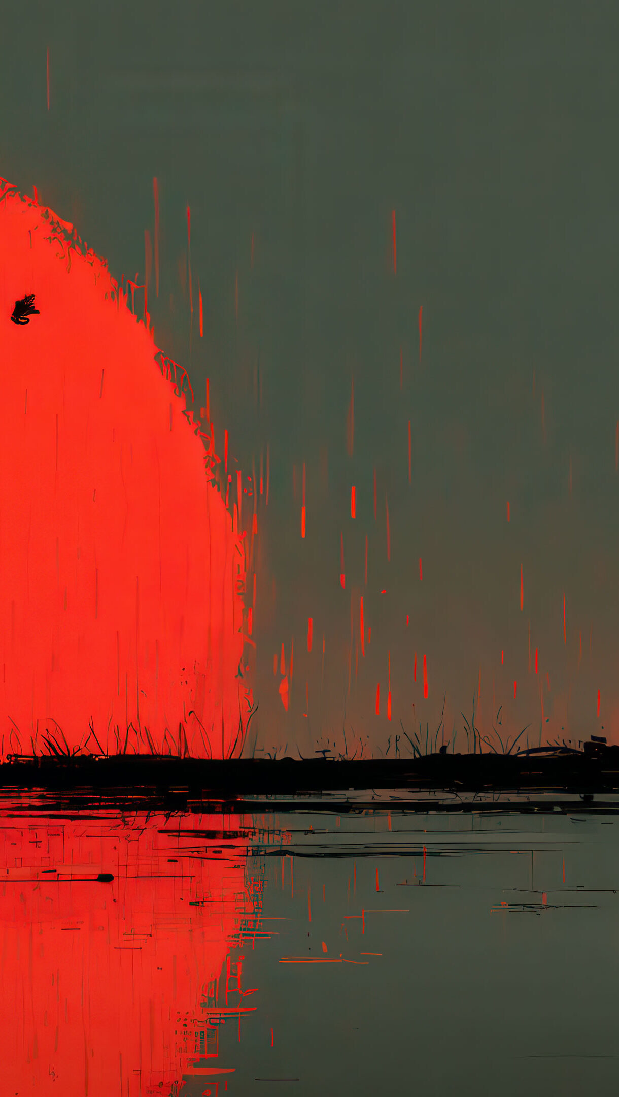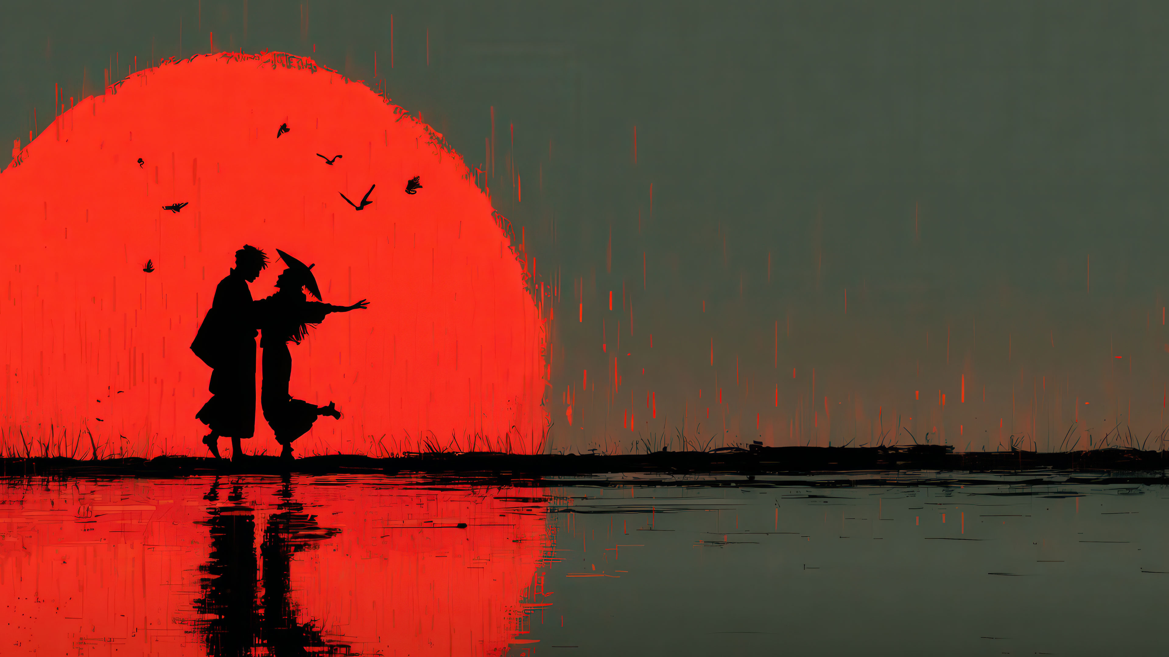 An evocative 4K wallpaper presenting two silhouetted figures, a couple, embracing by the water's edge under a colossal, fiery red sunset. The striking, mirror-like reflection of the intense red sun in the water, against the muted green-grey sky, creates a powerfully romantic and dramatic atmosphere.