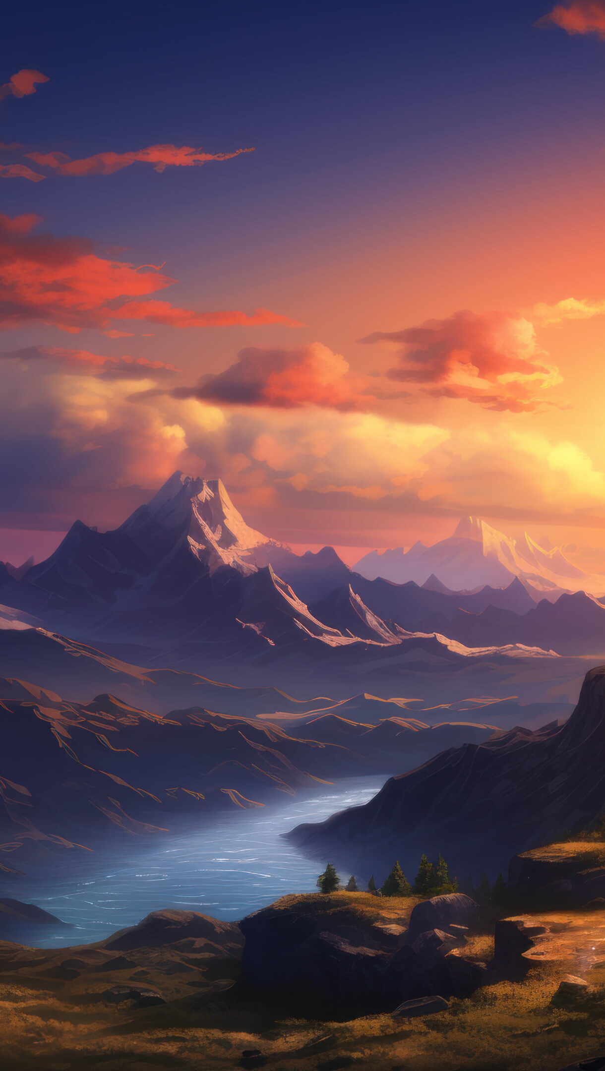 Experience the serene beauty of a 4K AI generated sunset wallpaper, capturing the breathtaking colors of the evening sky as the day transitions into twilight, set against a majestic mountain backdrop. Ideal for those who appreciate the beauty of nature and a calming scenic view as a desktop background. Simply click the download button to bring this masterpiece to life on your screen as a desktop wallpaper or save it for later in your picture collection.