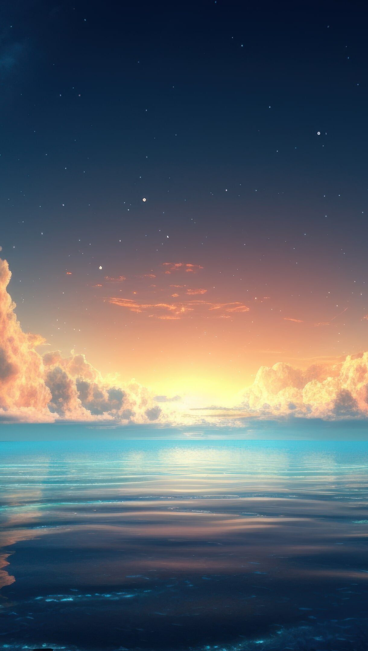 A breathtaking 4K wallpaper created by AI, capturing the serene beauty of a sunset over the sea, providing a stunning view of the ocean and the beach in the evening, perfect for enhancing your desktop background with the wonders of nature. Simply click the download button to bring this masterpiece to life on your screen as a desktop wallpaper or save it for later in your picture collection.