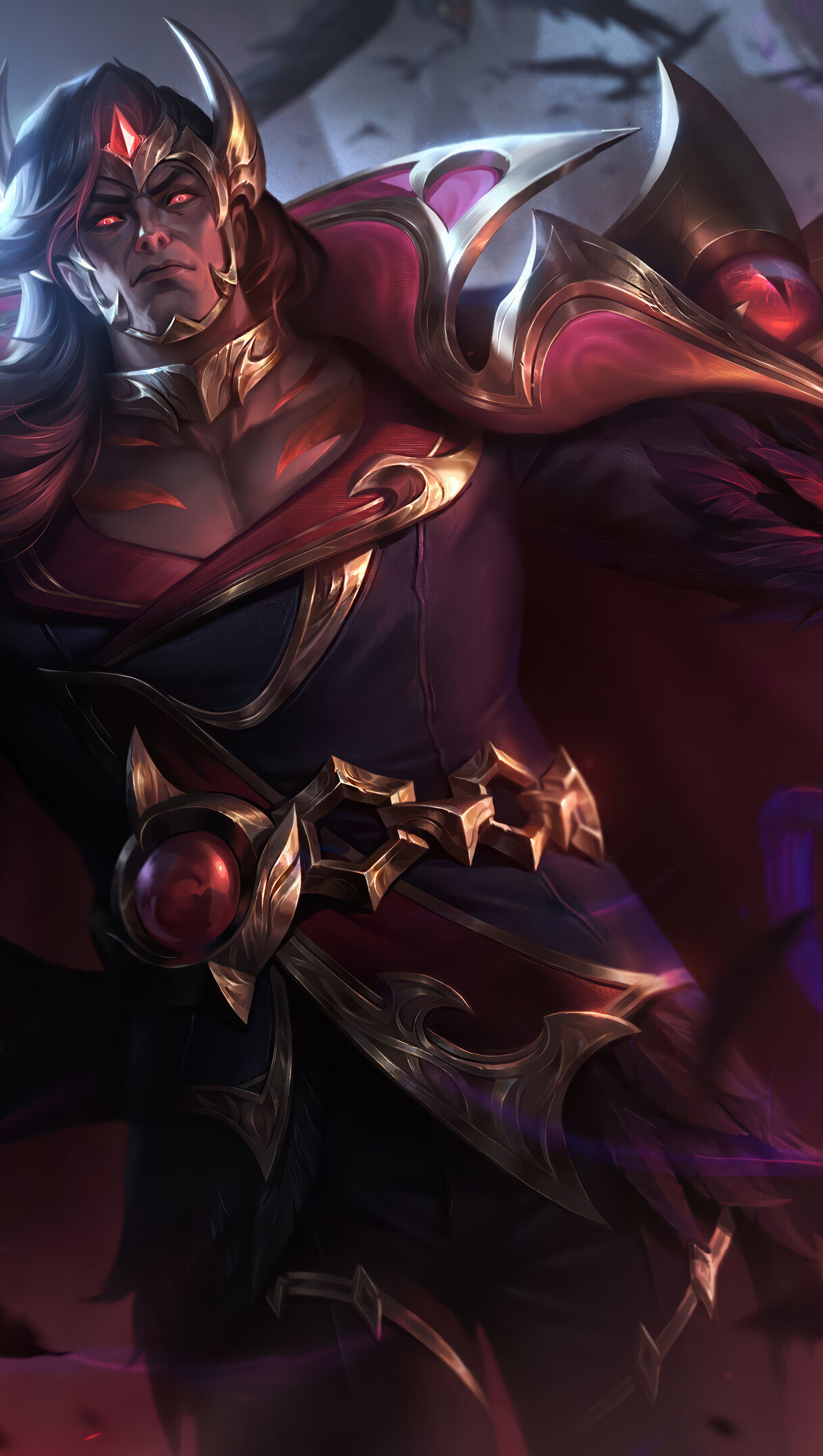 A dramatic 4K wallpaper featuring Nightbringer Swain, a formidable warrior with dark armor and glowing red eyes, amidst a swirling flock of ravens in a foreboding, twilight setting. The intense red and orange magical energy emanating from his transformed arm creates a fiery focal point, contrasting sharply with the cool blues and dark purples, encapsulating a mood of dark, unleashed power.